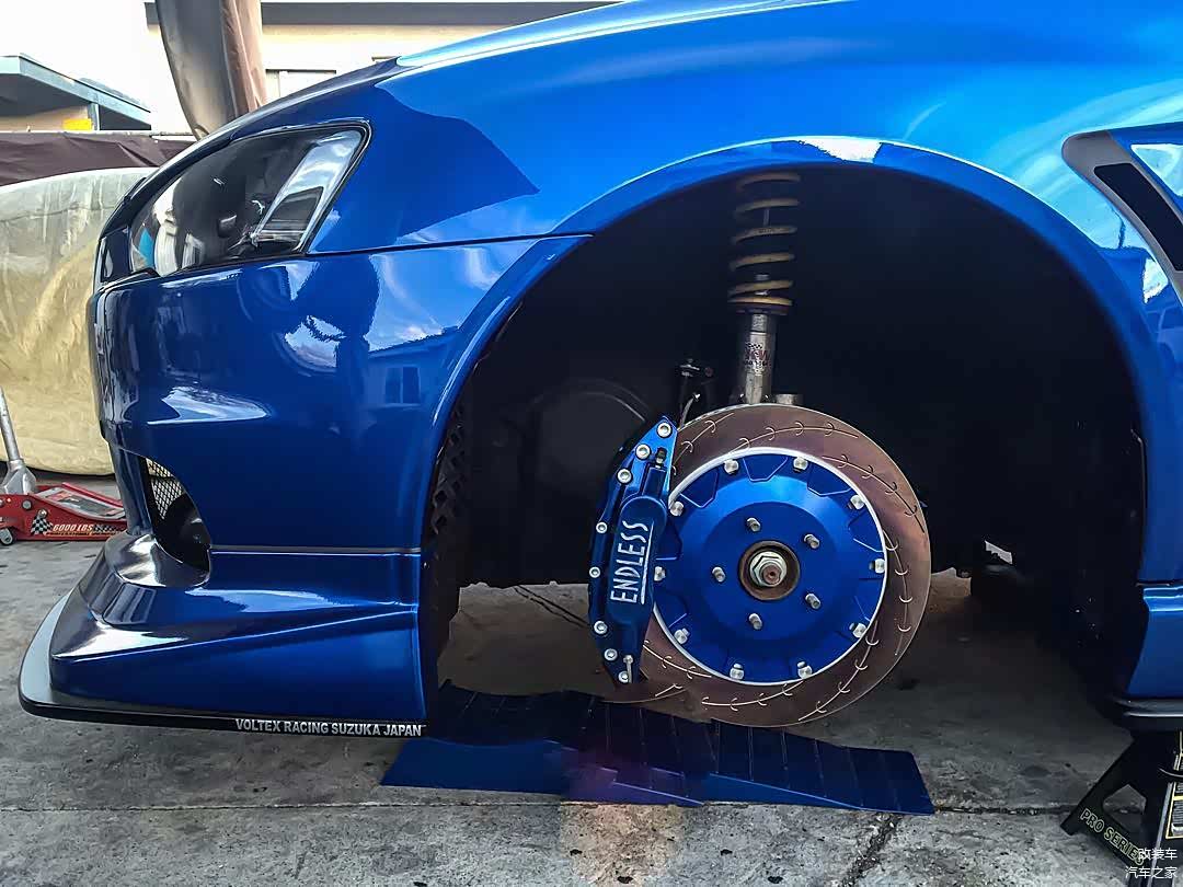 EVO原厂的Brembo刹车套件已有不俗实力,但要想追求性能更强的刹车,Endless前六后四活塞的大刹车套件绝对是不二之选,同时车主还升级了StopTech刹车钢喉。