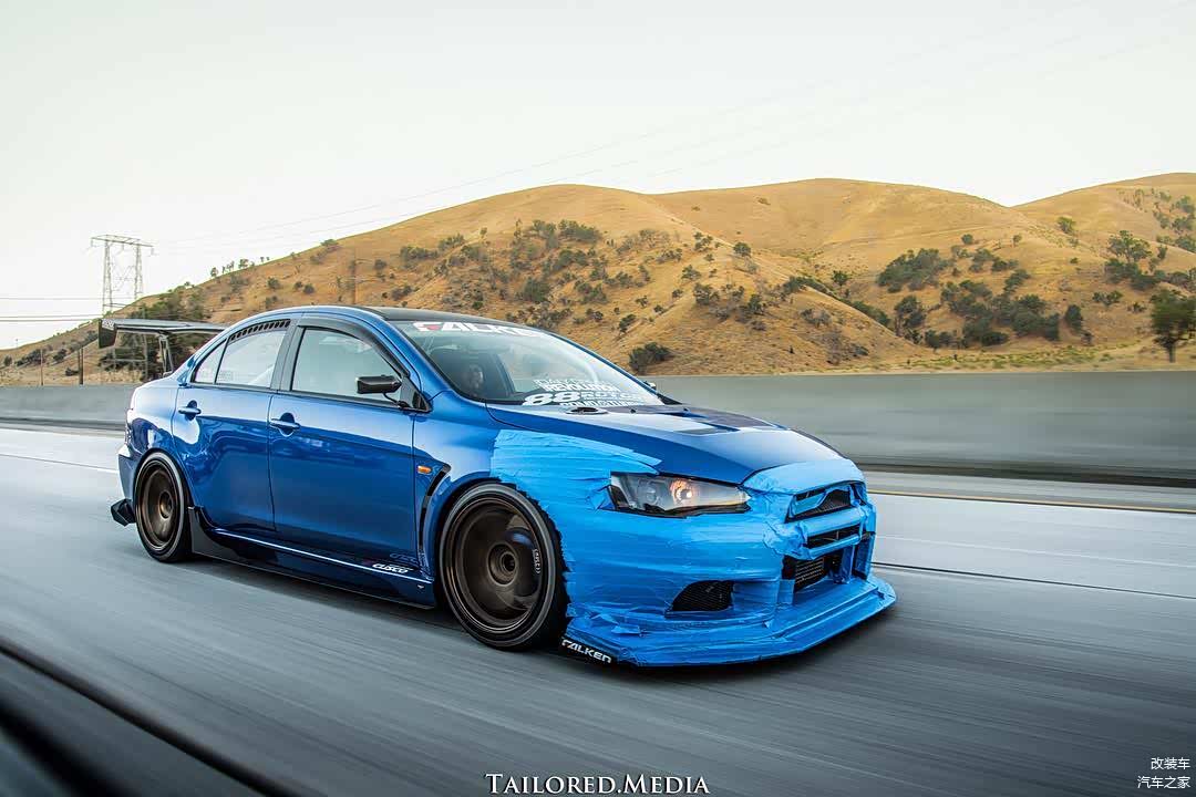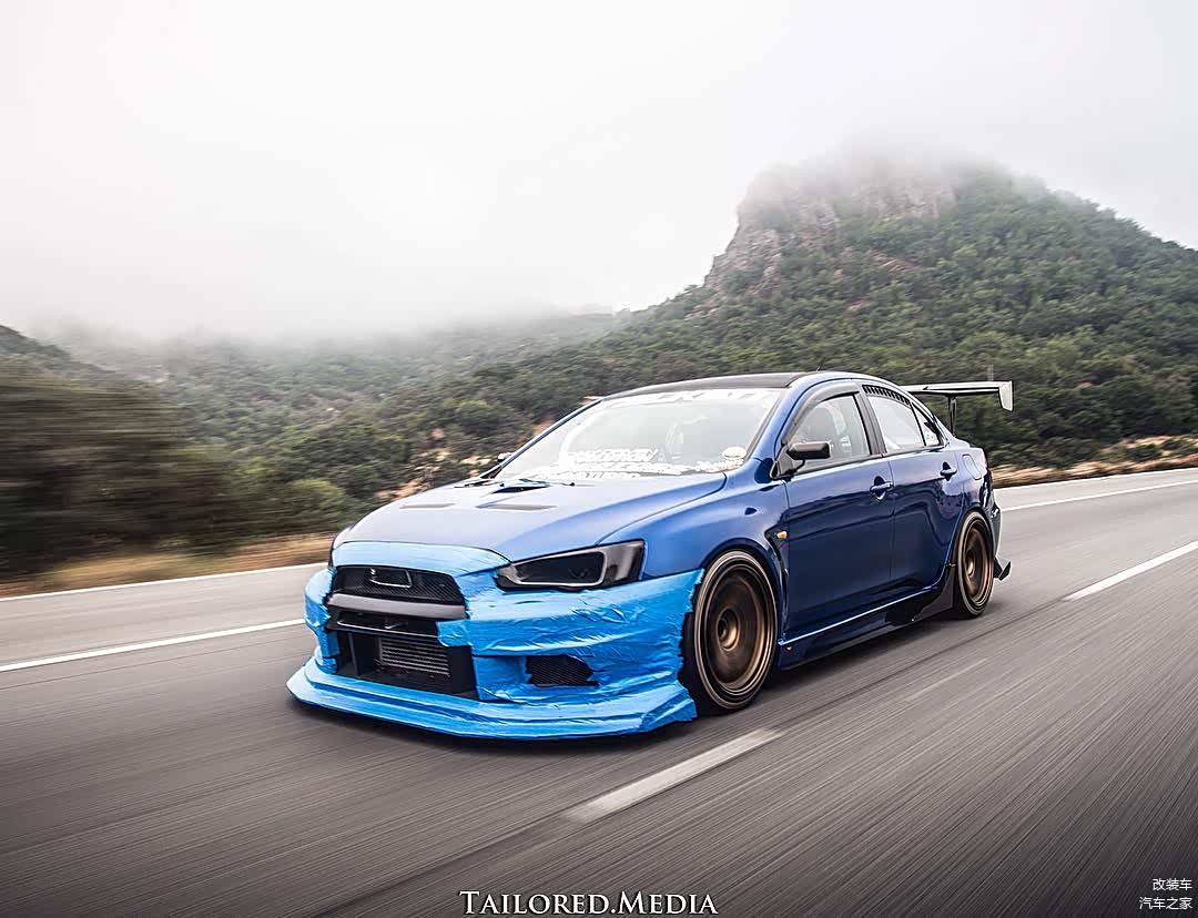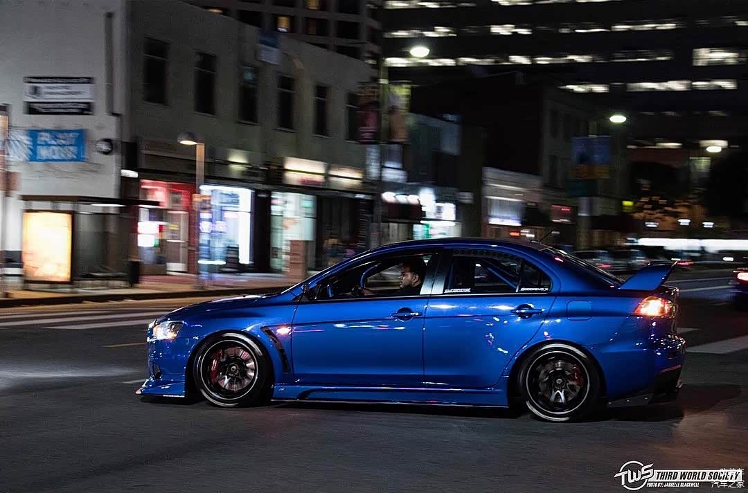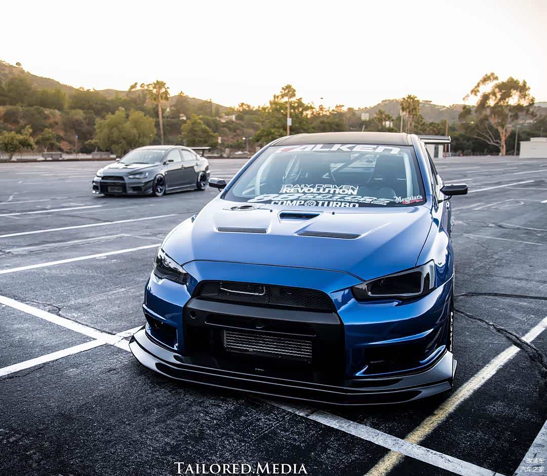 尽管少了一只"眼睛",但蓝色EVO X的气场却丝毫不减,灰色那台EVO怎么看也只是它的跟班。