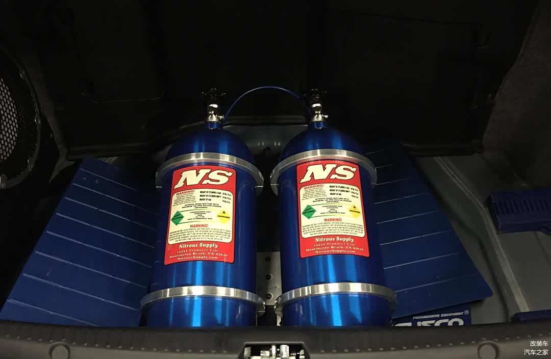 你以为后备箱这两个气罐是给空气避震储存气体的?这就错了,它们可是货真价实的氮气加速装置。需要时,向发动机内喷射一氧化二氮,高温分解出的氧气可以使更多的燃料得以燃烧,从而增大发动机输出功率,但考虑到这种装置长期使用会损坏发动机,车主平时都不会用到它。