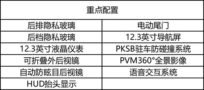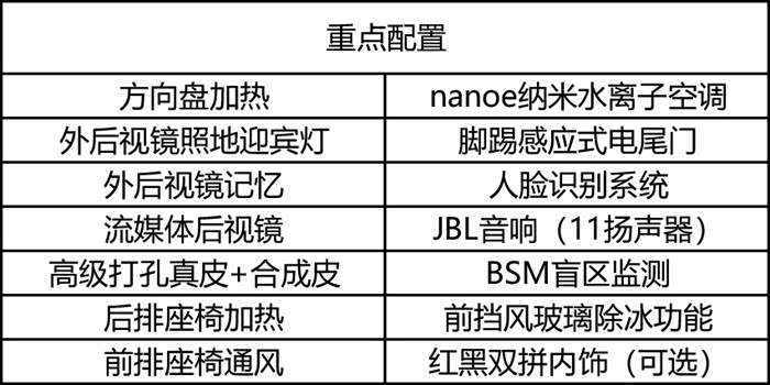 再加1.8万元,你可以获得更高级的打孔真皮(还可以选红黑双屏内饰)、前排座椅还能通风,后排座椅加热;另外像盲区监测也能提升你的驾驶安全性。如果你还想要把车变得更高级,像流媒体后视镜、人脸识别系统、脚踢感应式电尾门也可以满足你的需求。当然了,按照以往惯例,顶配车型都是图腾的存在,一般不会作推荐购买。所以看看就好。