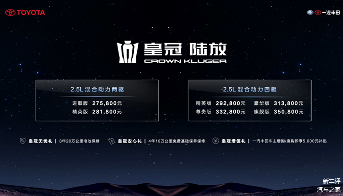本次皇冠陆放的售价区间为27.58-35.08万元,一共推出2款两驱、4款四驱车型,共计6个版本可选。所有版本均搭载2.5L THS混合动力系统,其中2.5L内燃机为192匹马力,前驱版电机总功率为134kW、总扭矩为270Nm,四驱电机总功率为174kW、总扭矩为391Nm。