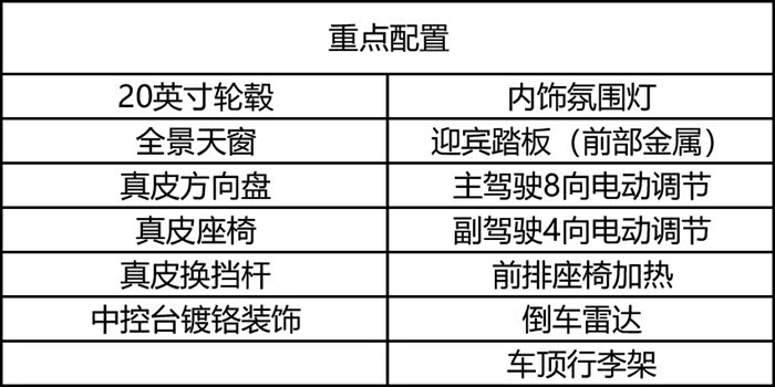 如果再加2.1万元,那么你可以获得235/55 R20的铝合金轮毂、内饰氛围灯、全景天窗、金属迎宾踏板、真皮方向盘、主驾驶8向电动调节、真皮座椅、副驾驶4向电动调节、真皮换挡杆、前排座椅加热、中控台镀铬装饰、倒车雷达、车顶行李架。