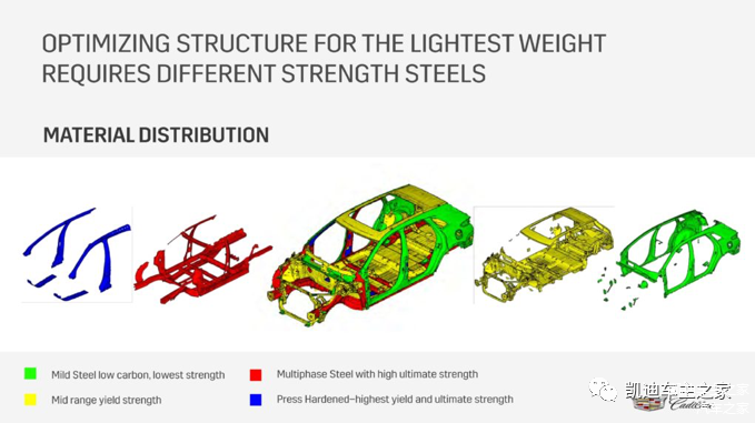 我们把视线挪到白车身部分,根据公开信息,白车身的A柱,B柱和车顶边框部分被高强度钢(红色),超高强度硼钢PHS(蓝色)充分覆盖,而从A柱到车顶到B柱的部分,则是超高钢+高钢+低碳钢三层(红+蓝+绿)复合结构,凯迪拉克给这个组合起了一个还挺酷的名称:BFI高强度一体式高强度车架。