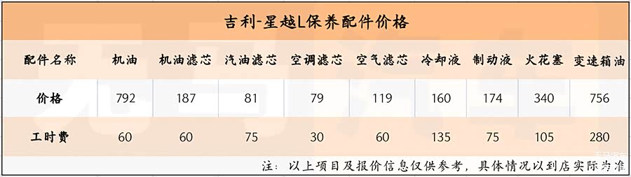 配备“越级”的动力总成,多少是要付出些“代价”的,代价就是花费更多的金钱成本——从以下我们所制作的表格中不难看出吉利星越L相较于同级别车型整体的配件价和工时费都是偏高的,甚至比部分同父异母的领克车型还要夸张,这对于国产车而言是很难想象的。