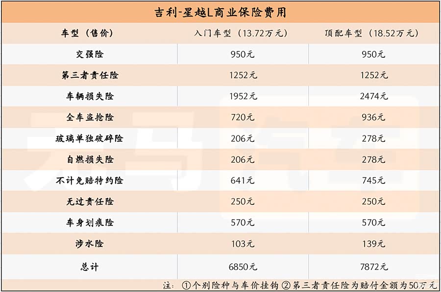 目前在售的星越L共有6款配置车型,售价区间为13.72-18.52万元,而鉴于个别险种价格与其车型售价是相挂钩的考虑,经计算,星越L的商业保险费用区间为6850-7872元。当然,如果没有出险的话,后续的保险费用是会逐年下降的,因为这里计算的是全险,会偏贵些,在这里我们姑且先算星越L一年的商业保险费用为6850元,以便更好理清养车费用项目。
