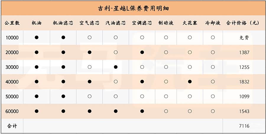 而按照惯例,如果以每年行驶20000公里计算,吉利星越L三年的保养费用结算周期即是截至60000公里为止,经计算,其需要产生的总费用为7116元,平均一年为2372元。不过需要提多一嘴的是这个价格是撇除买保养套餐或代金券的结果,如果你有上述两项优惠方式的话,保养的价格就可以再压一压。