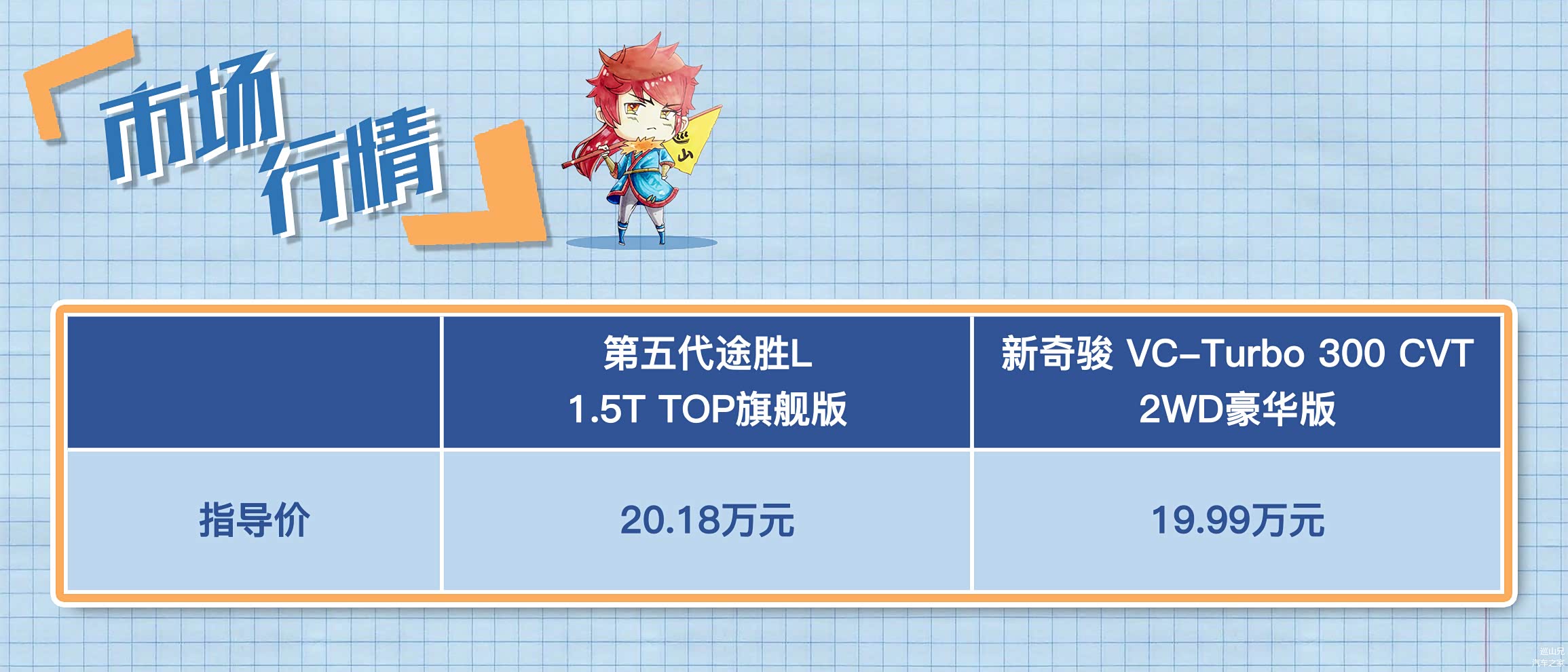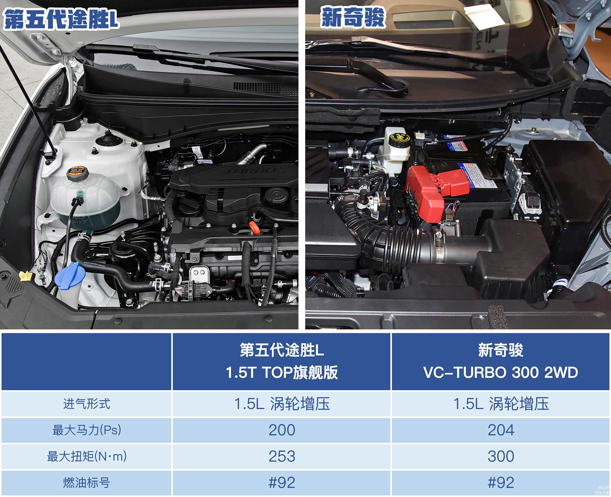 首先介绍下今天参与对比的两位选手,分别是指导价20.18万元的第五代途胜L 1.5T TOP旗舰版和指导价19.99万的新奇骏 VC-Turbo 300 CVT 2WD豪华版。第五代途胜L目前在全国普遍有五千元左右的终端优惠且有现车,而新奇骏目前新车上市,送购车大礼包,暂无现金优惠,提车周期约为15~30天。