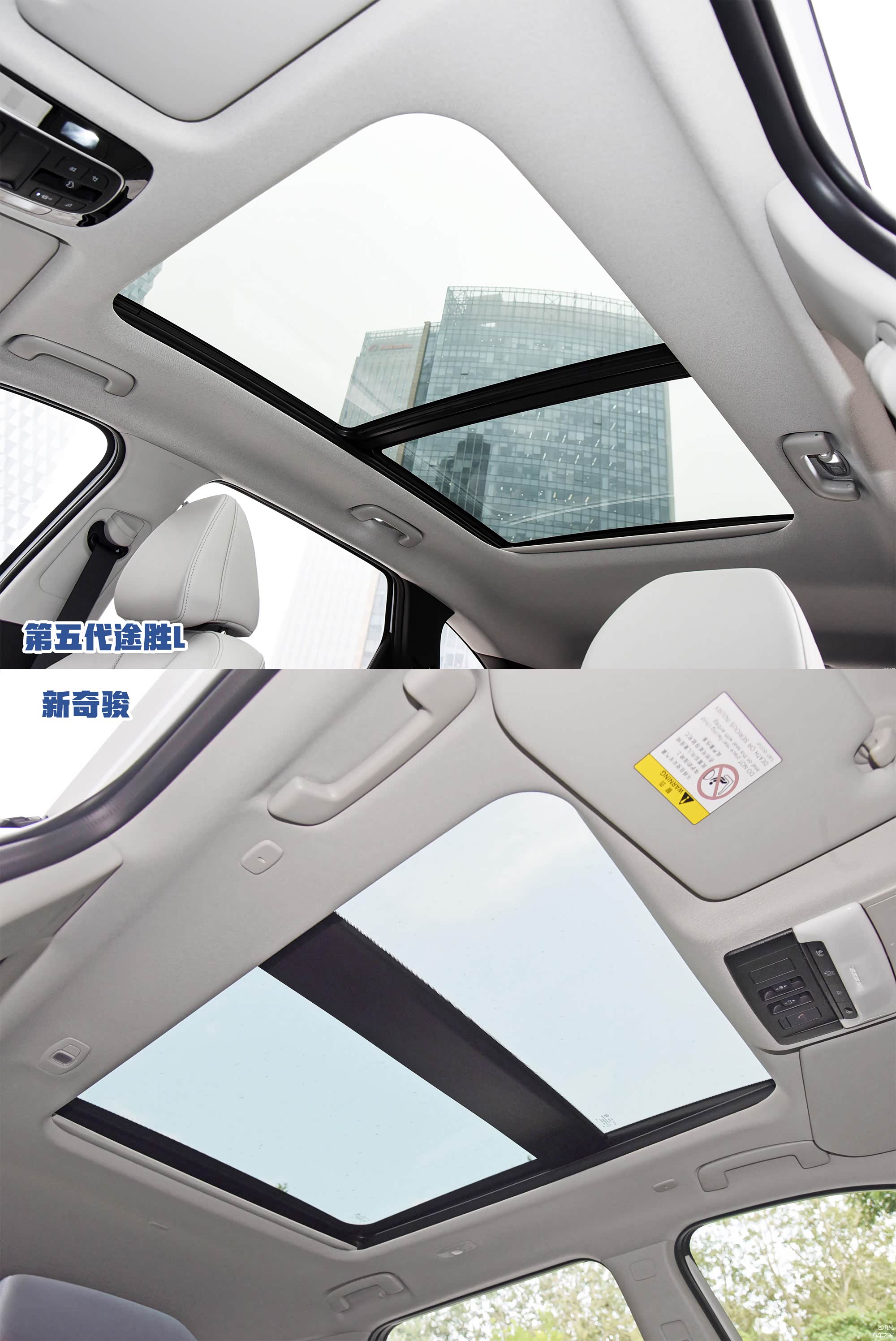 天窗方面,两款车斗都装备了国内消费者比较喜欢的全景天窗。第五代途胜L 1.5T TOP旗舰版全景天窗尺寸为长1110mm,宽705mm。新奇骏 VC-Turbo 300 CVT 2WD豪华版的全景天窗尺寸为935mm*700mm,没有第五代途胜L 大。