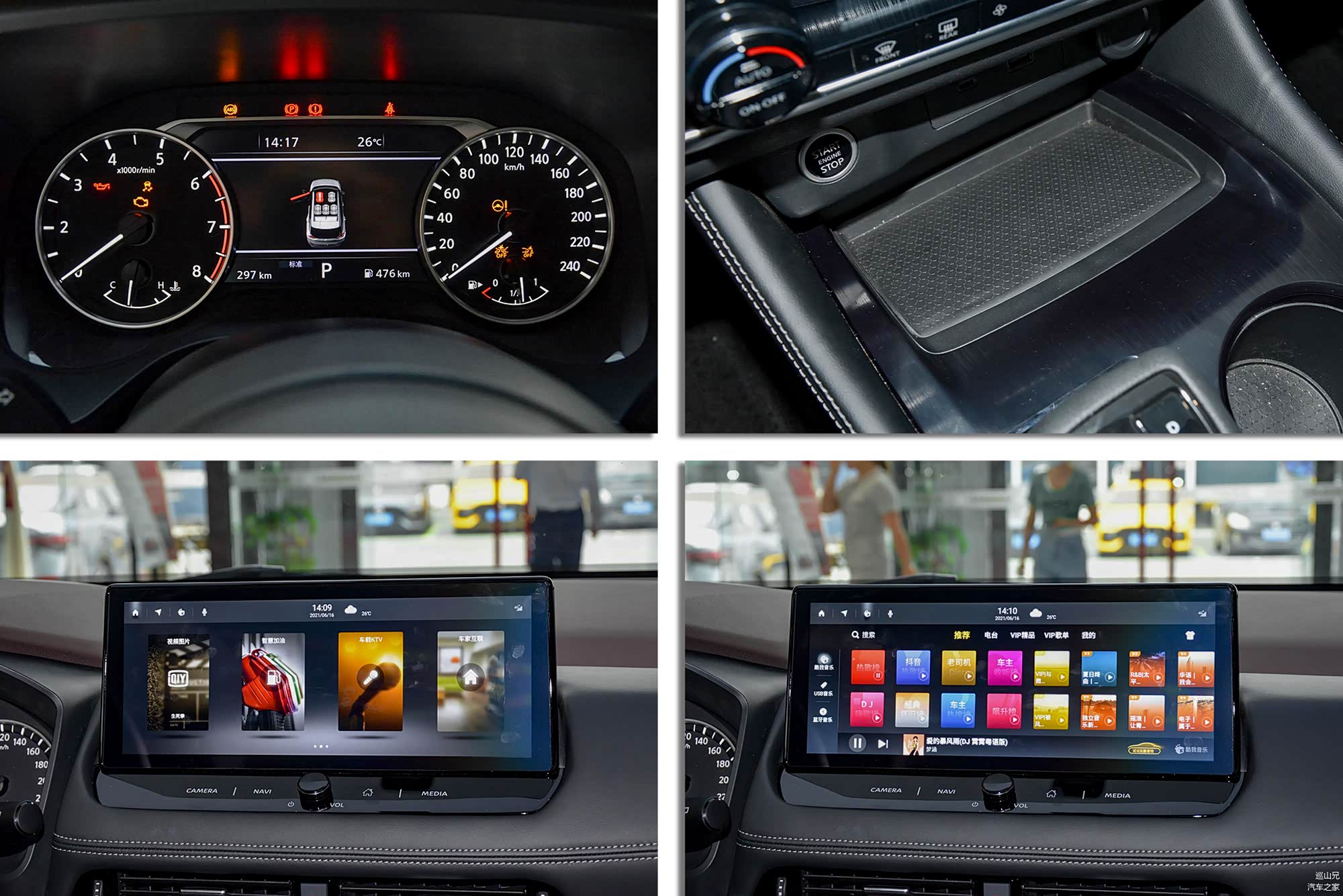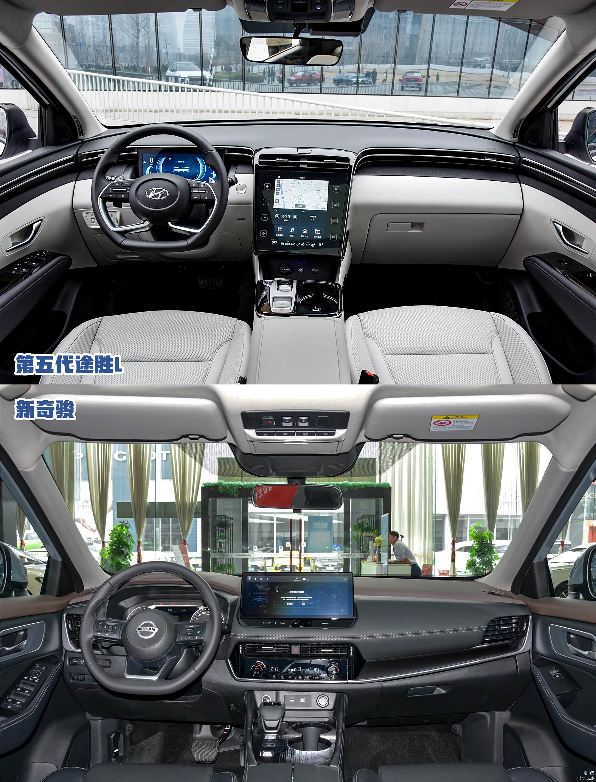 进入车内,两款车的设计都比较有层次感。第五代途胜L 1.5T TOP旗舰版有深浅两种颜色可选,其中浅色内饰非常显档次。内饰用料方面,第五代途胜L内饰大面积采用软质材料包裹,配合上铝合金饰板和钢琴烤漆饰板,让整个内饰看起来设计感十足。新奇骏 VC-TURBO 300 2WD版的内饰为黑色,比第五代途胜L 1.5T TOP旗舰版的浅色内饰单调不少。中央悬浮式多媒体屏幕的尺寸非常大,让整个内饰看起来比较有科技感。此外,众多的储物盒让手机、钥匙、钱包、水杯等随身物品也都有地方安放。