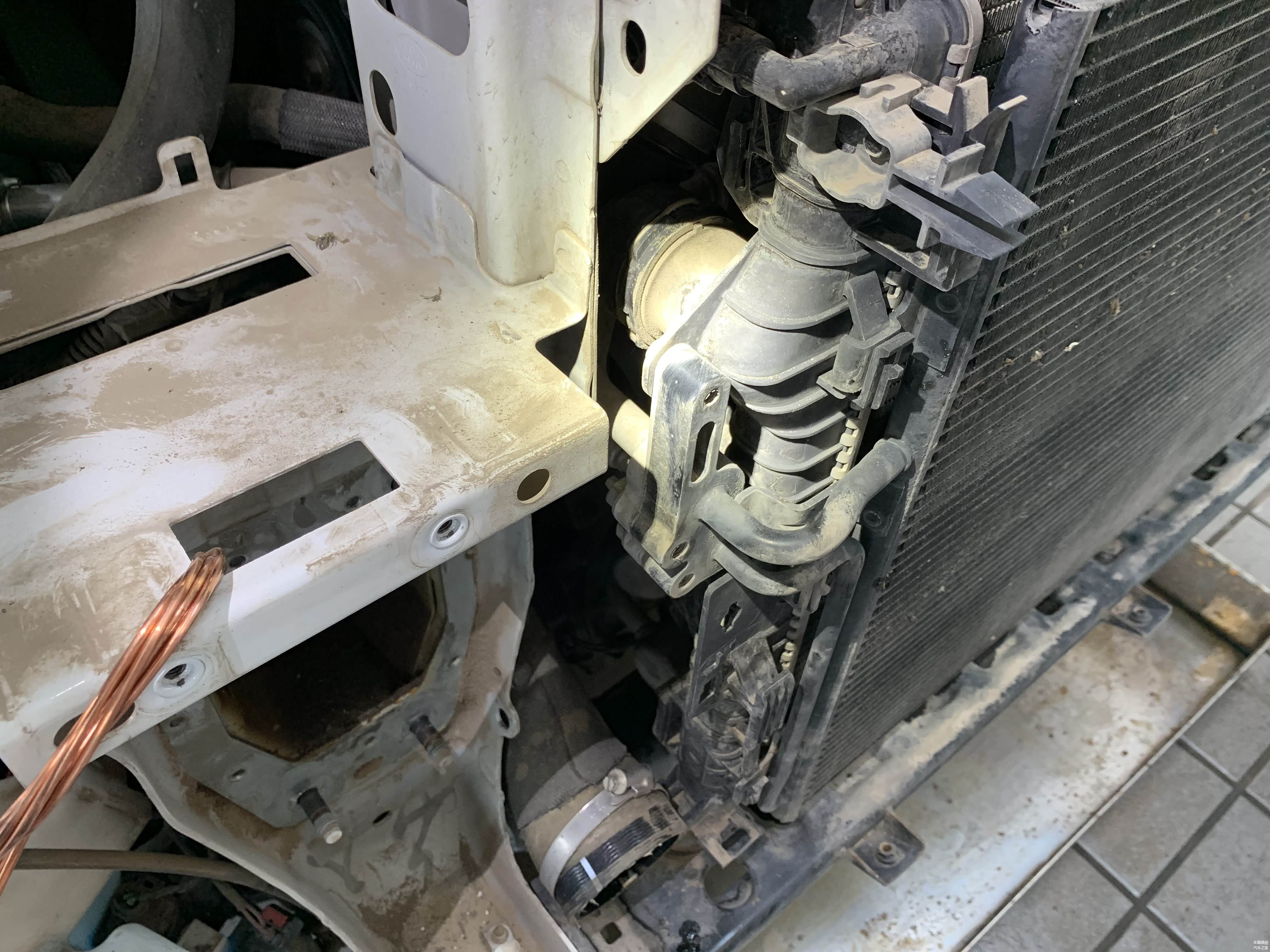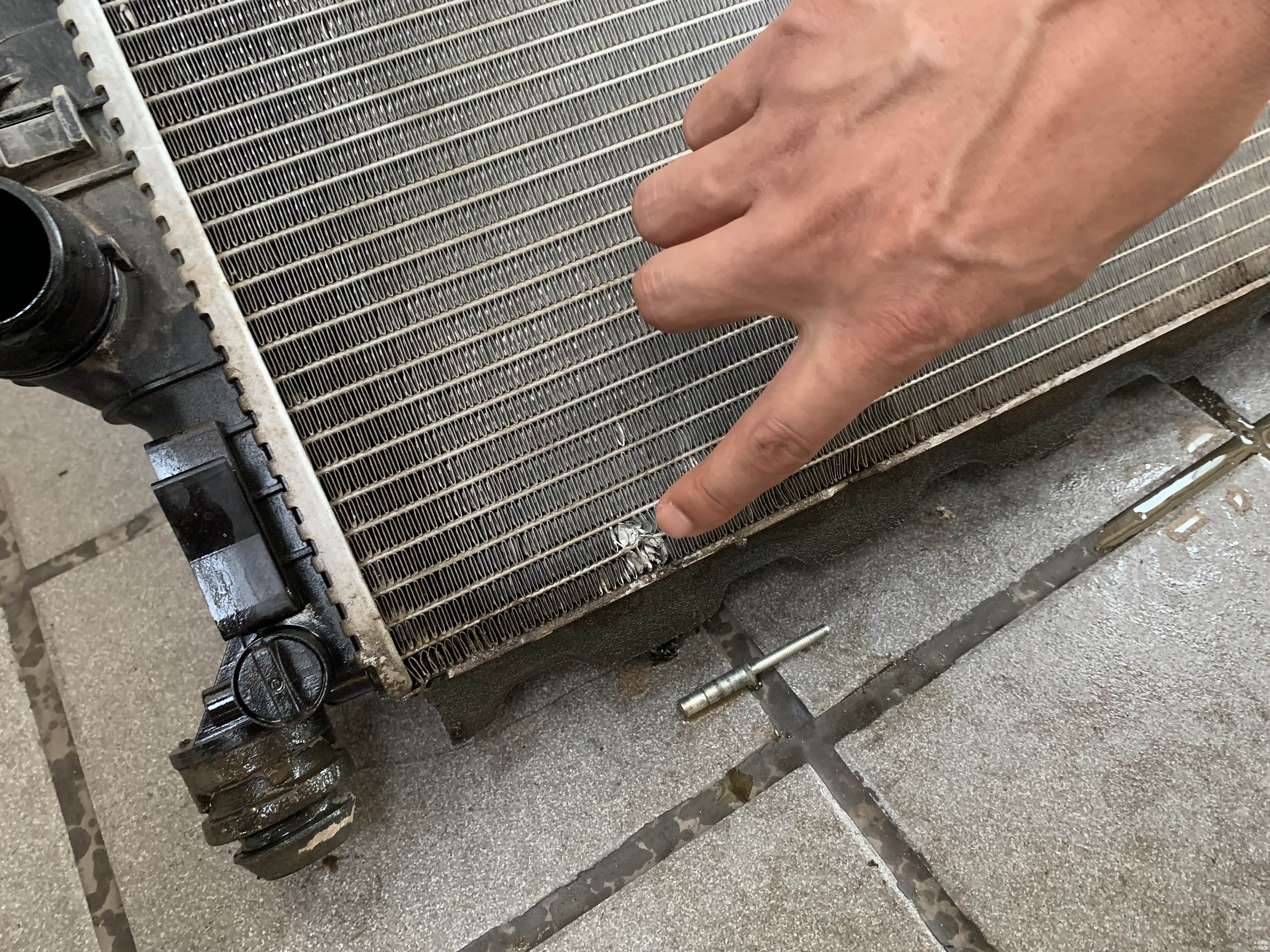 然后开始拆冷凝器和散热器,卸掉螺丝后直接拆了下来。拆分冷凝器和散热器,拆开之后发现散热器上有一颗很大的铆钉,铆钉造成了散热器的损坏,然后漏防冻液。