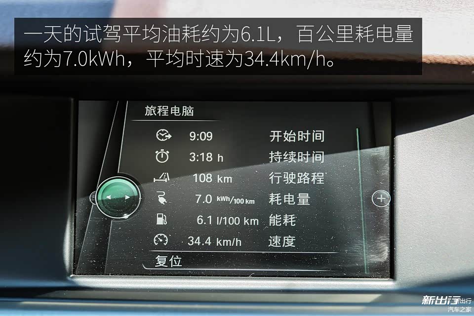 而在一整天的试驾中,我们经历了城市路况、高速路宽、又陡又曲折的山路,一共行驶了 108km,行车电脑显示百公里平均油耗为 6.1L,百公里平均耗电量为 7kWh,不管是油耗还是电耗都是相对很省了。