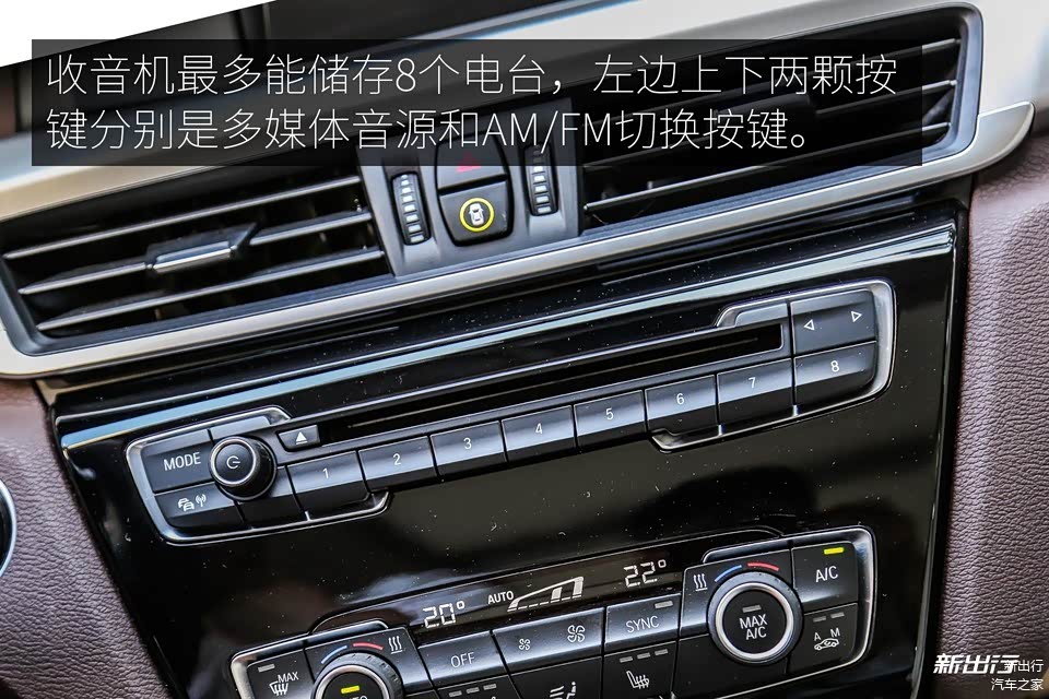 屏幕下方是电台收音机控制区域,最多可以储存8个电台。左边的两个按键分别是切换多媒体音源(例如蓝牙、USB、电台等)和切换 AM/FM 电台按键。