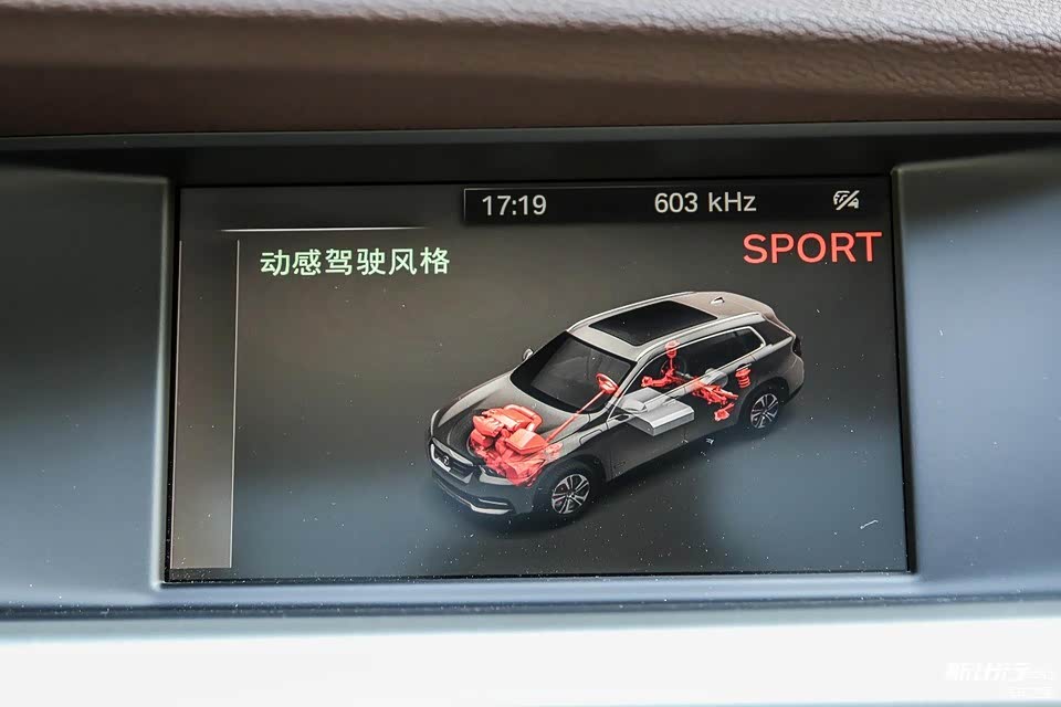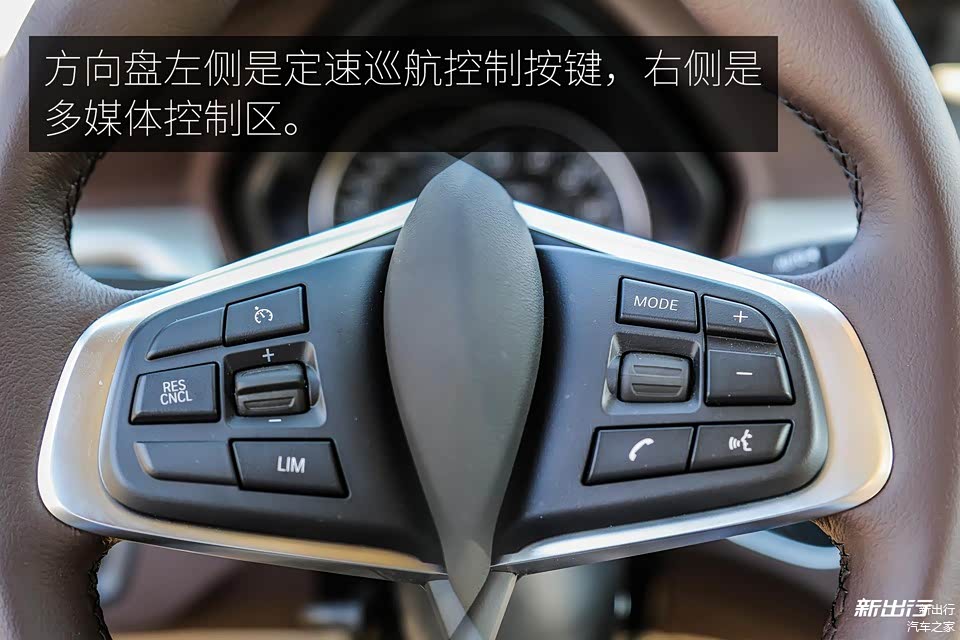 真皮方向盘无论是大小还是手感都非常的合适,切换到 SPORT 模式,转向力度会有所增加。方向盘左边是常规的定速巡航控制按键,右边是多媒体控制按键。