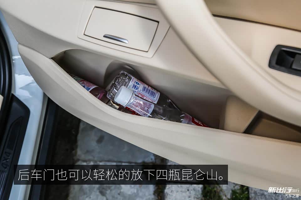 之诺 60H 的储物空间让我非常满意,四个车门的储物格很大,不但开口足够,而且深度也足够深,能放进4瓶昆仑山也不怕会掉出来。前排中控挡杆前方提供两个杯架,能放下普通的 500ml 饮料瓶。中控扶手箱保留了宝马一贯的双层隔板传统,不过扶手箱的空间就不是很大了。