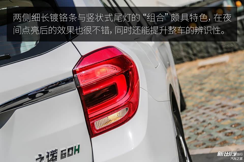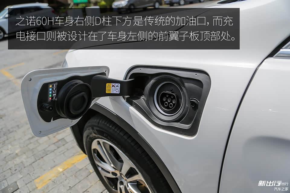 由于“流动的力量”设计理念的导入,让之诺 60H 车身侧面的腰线更加柔和,尤其是任何拐角的细节处均为浑圆的过渡,不过中间“俯冲式”的直线设计也突出了一定的运动感。值得一提的是,车身右侧 D 柱下方是传统的燃油添加口,充电接口则被设计在了车身左侧的前翼子板顶部。