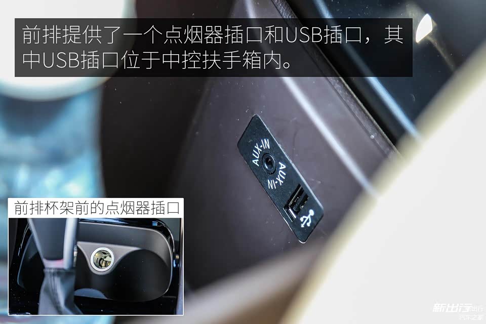 之诺 60H 前排配备了一个点烟器插口和一个 USB 插口,分别位于中控杯架上方以及中控扶手箱第二层内部,后排则只提供一个点烟器插口,位于空调出风口下方。