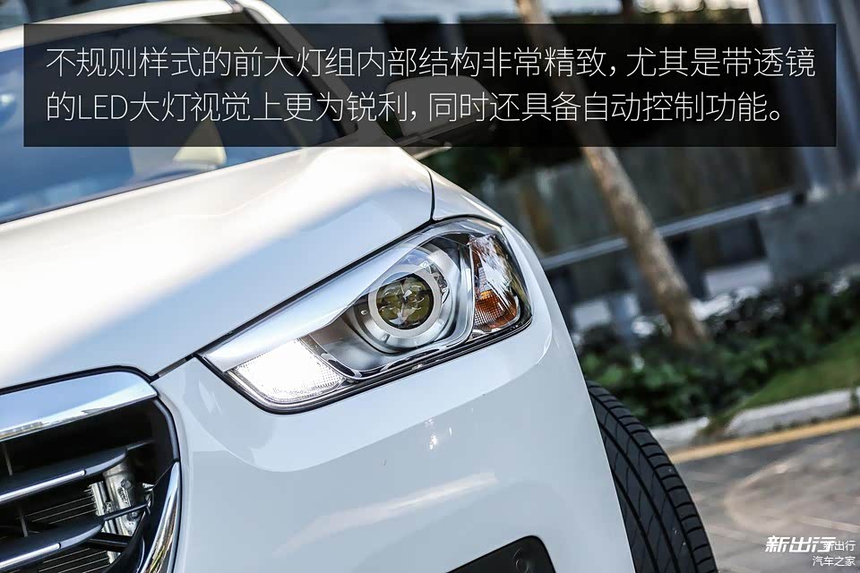 不规则样式的前大灯组内部结构非常精致,尤其是带透镜的 LED 大灯视觉上更为锐利,同时还具备自动控制功能,以保证在不同行车环境中始终拥有最佳照明视野。下进气口与雾灯区域采用了一体贯穿式的设计,其中雾灯区域同样也使用了细长型镀铬条来装饰,同时前唇的设计也突出了一定的越野特质。另外,在前保险杠上还配备了4颗雷达,这在日常泊车时会非常实用。