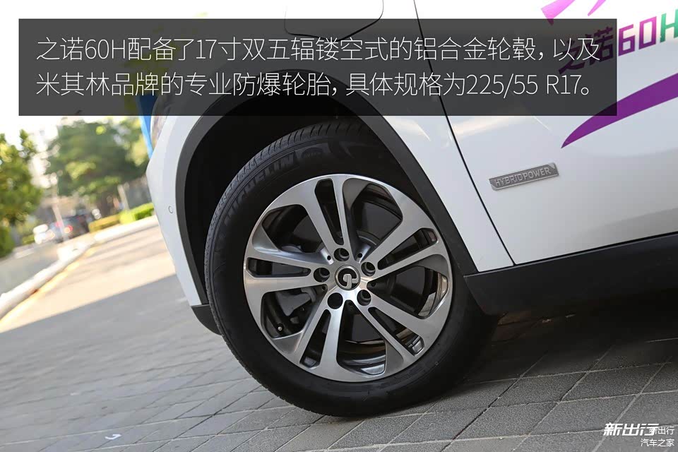 上下双色的外后视镜不仅集成了转向灯,同时还支持电动折叠、电动加热、驻车辅助和带有记忆功能。与此同时,该车还配备了 17 寸双五辐镂空式的铝合金轮毂,以及米其林品牌的专业防爆轮胎,具体规格为 225/55 R17。另外,在前车门左下角处有张贴“HYBRID POWER”的名牌来彰显其混动车的身份。