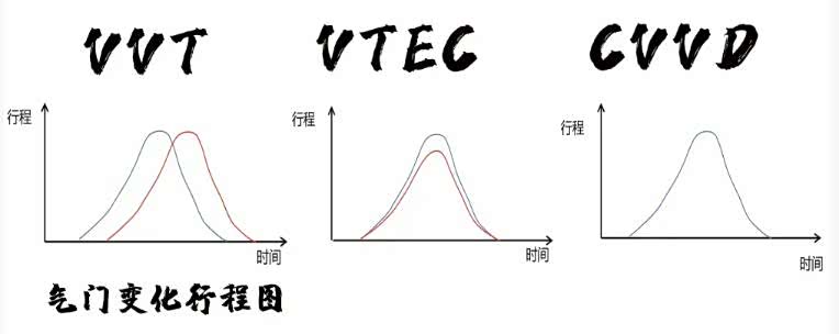 CVVD的凸轮和凸轮轴不是固定连接的,其中旋转中心是可移动凸轮轴心,而气门打开时间长短就是通过旋转中心来控制的,旋转越快打开时间越短,旋转越慢打开时间越长。