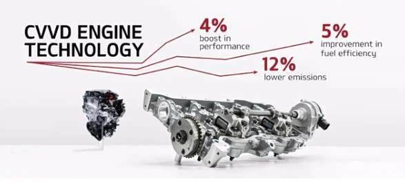 大家都知道,燃油汽车一般是通过"吸气—压缩—做功—排气"使燃料燃烧产生动力的。CVVD就是将发动机低功定速时吸气气门打开时长延续到压缩冲程的中后期来减少压缩时的阻力从而减少油耗的,同时也在车辆提速时提前关闭吸气气门于压缩冲程的初期来增加空气量帮助燃烧从而提升了发动机的扭矩、改善了加速性能。燃油的充分燃烧自然而然的也就降低了尾气的排放量了。根据统计,搭载CVVD的汽车发动机性能可提高了4%以上,燃油经济性提高了5%以上,同时降低了12%以上尾气排放量。