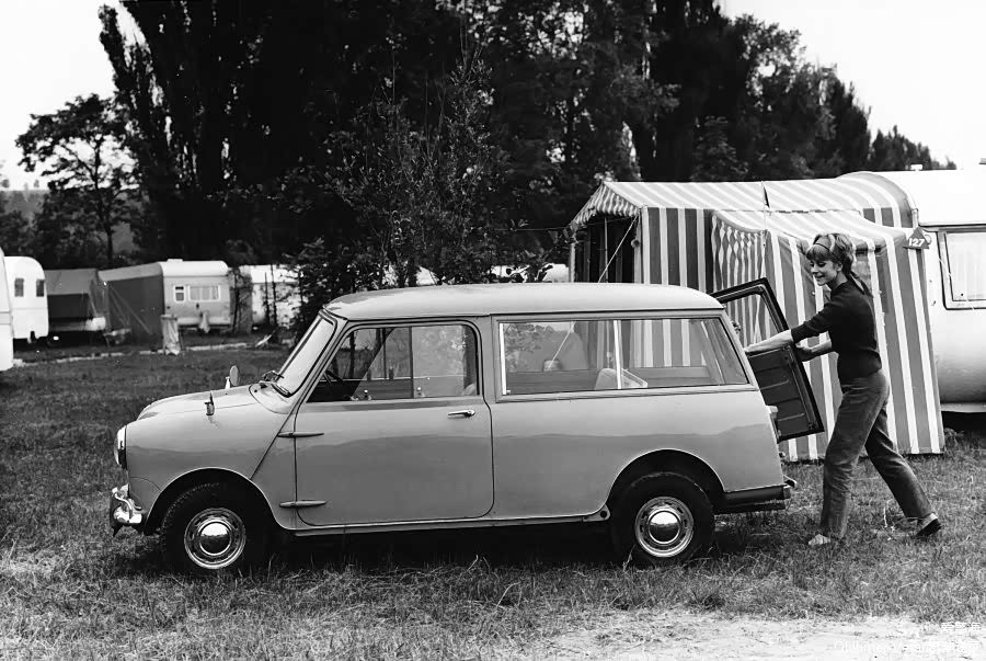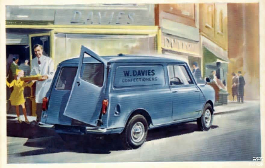 第一个目标群体是商业客户。1960年5月,奥斯汀和莫里斯Mini厢式旅行车推出。整车长度明显增加了9.5英寸,但钢制面板的侧面同样隐藏了一段4英寸长的轴距。通过一对侧开的后门可以进入容量为46立方英尺的行李舱。巧妙的设计将备用车 轮和蓄电池隐藏在地板下,其下面的油箱隐藏在后轮后方。厢式旅行车一经推出便广受欢迎,邮局和汽车协会订购了几百辆新车,开始取代以前巡警使用的三轮摩托车。
