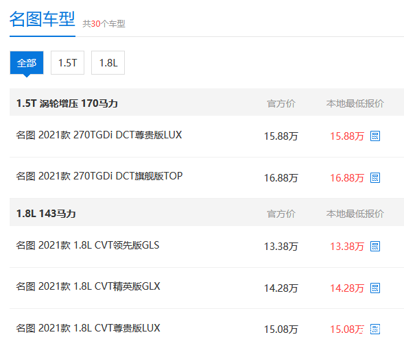 肇庆地区某汽车经销商近日公布了名图在本地区的优惠行情:目前名图购车暂无优惠,13.38万元起售,具体售价信息如下图所示: