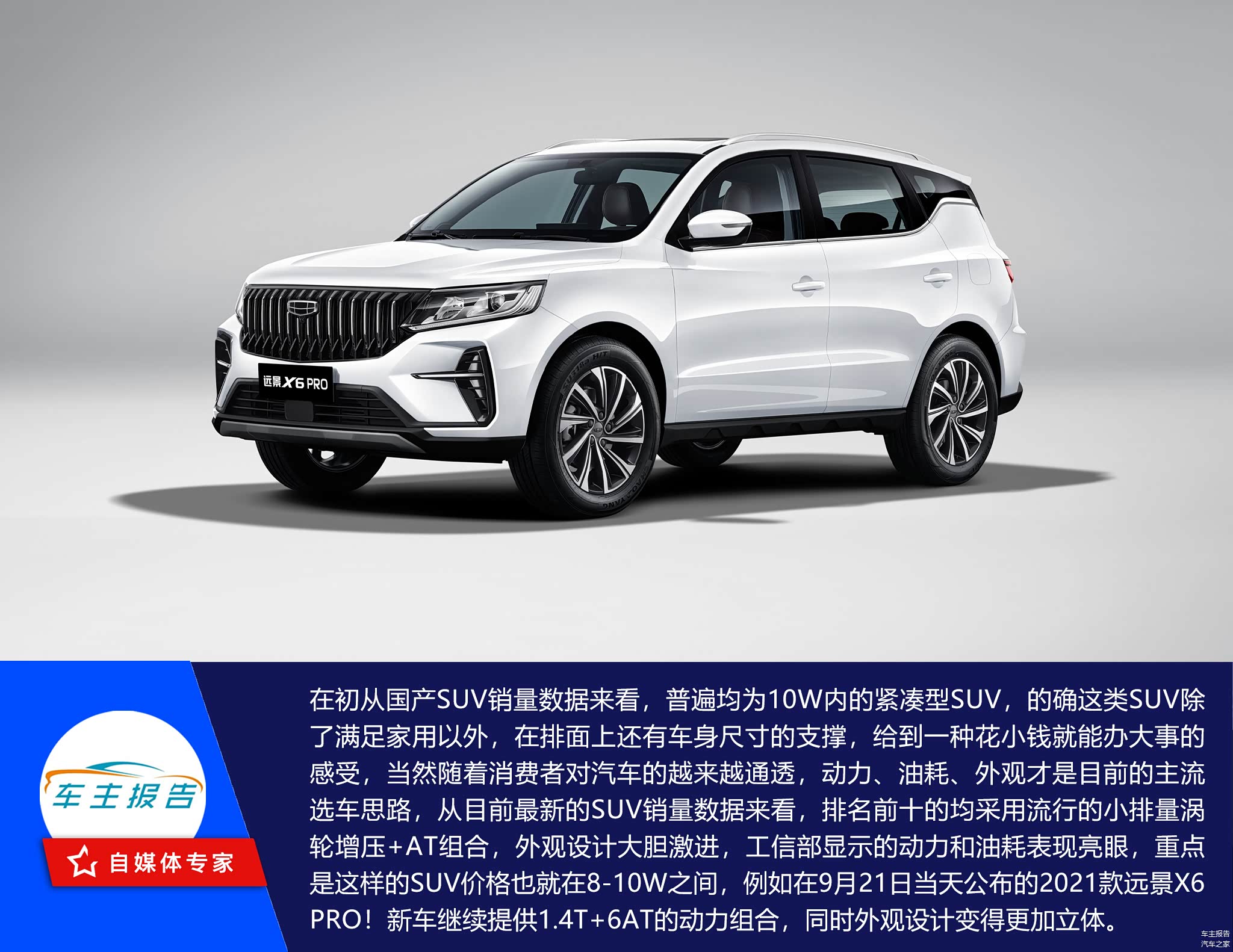 在初从国产SUV销量数据来看,普遍均为10W内的紧凑型SUV,的确这类SUV除了满足家用以外,在排面上还有车身尺寸的支撑,给到一种花小钱就能办大事的感受,当然随着消费者对汽车的越来越通透,动力、油耗、外观才是目前的主流选车思路,从目前最新的SUV销量数据来看,排名前十的均采用流行的小排量涡轮增压+AT组合,外观设计大胆激进,工信部显示的动力和油耗表现亮眼,重点是这样的SUV价格也就在8-10W之间,例如在9月21日当天公布的2021款远景X6 PRO!新车继续提供1.4T+6AT的动力组合,同时外观设计变得更加立体。