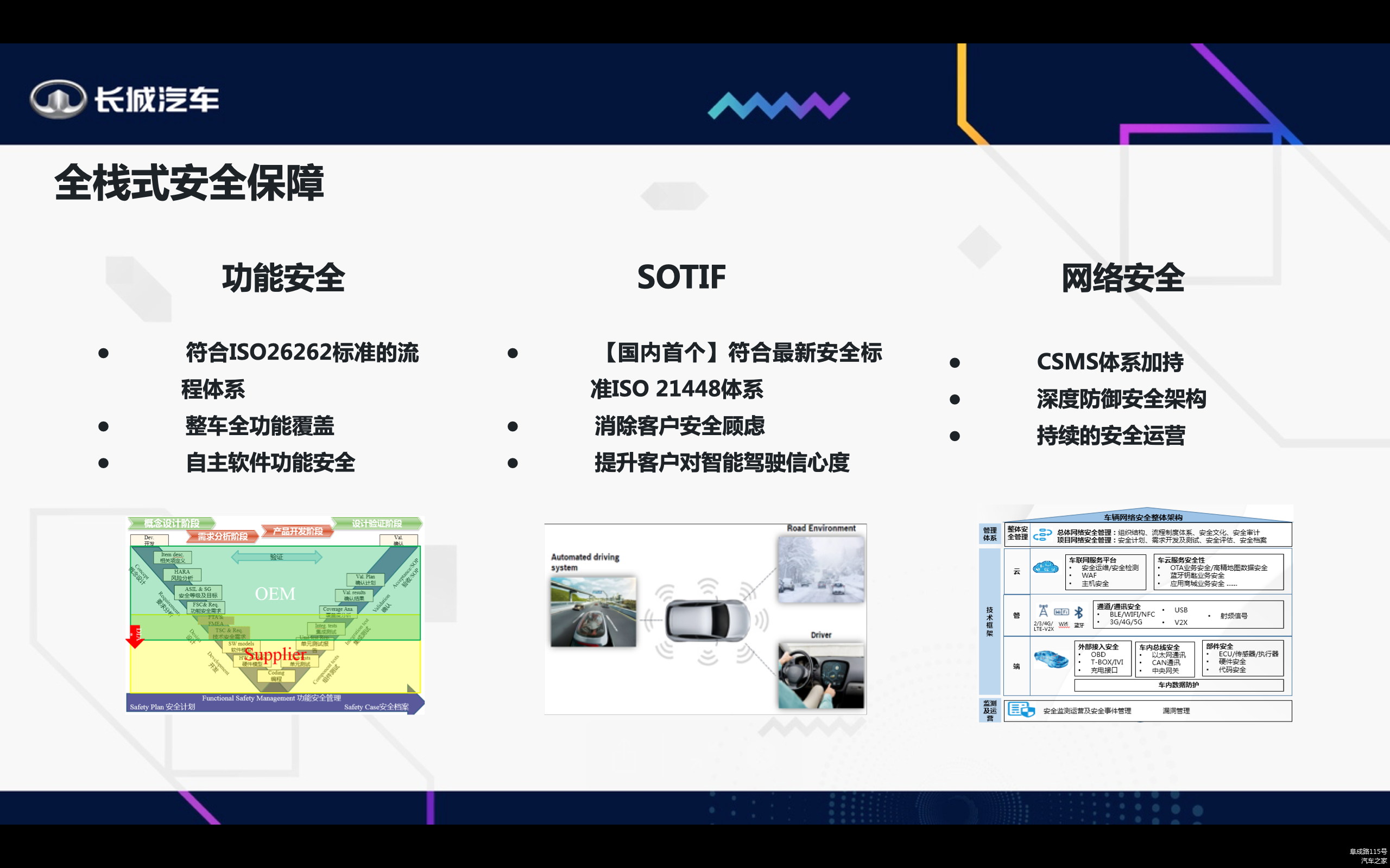 安全性上,长城汽车全新电子电气架构多维度构建全栈式安全保障。网络安全层面,拥有CSMS体系加持,长城汽车打造融合车内部硬件加密、通讯加密校验的全维度纵深防御安全架构。平台安全方面,长城汽车定制的操作系统独立于硬件的核心、共用基础软件平台,保证了软件的可维护性、可靠性和安全性。功能安全上,长城汽车融合冗余感知、冗余控制、冗余执行、冗余供电及冗余通讯,最高可满足ASILD功能安全需求。SOTIF(预期功能安全)方面,长城汽车全新电子电气架构符合最新预期功能安全标准ISO 21448体系,覆盖道路环境、自动驾驶系统等方面,有效地消除客户安全顾虑。