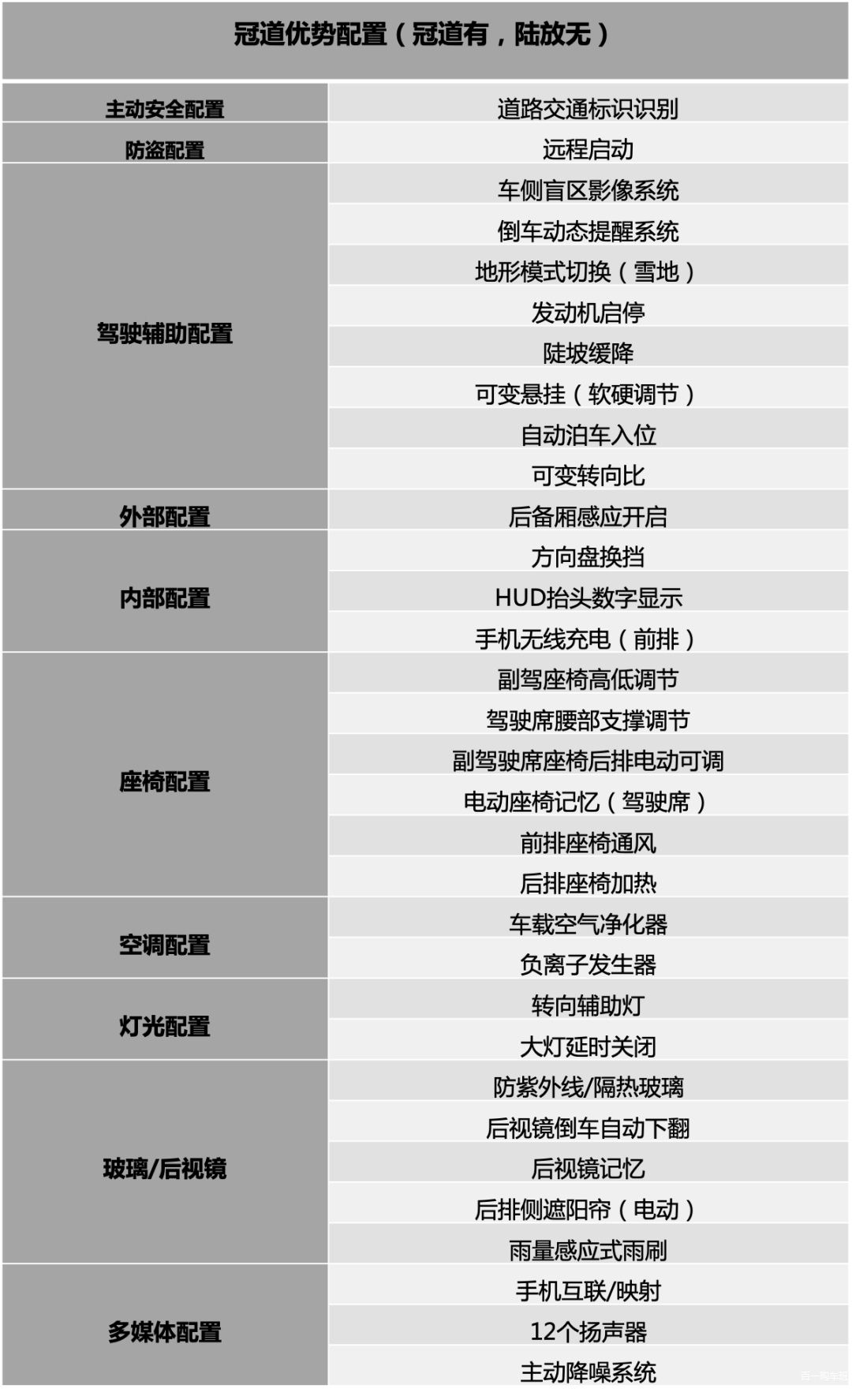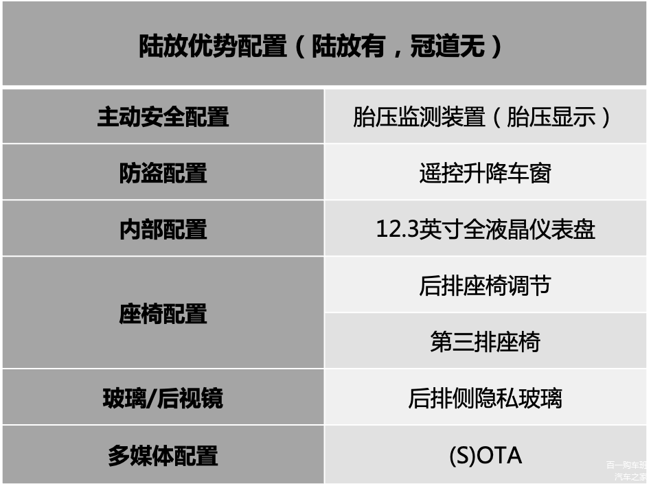 大致来看,冠道共计有近30多项主流配置占绝对优势,其中像驾驶辅助配置优势巨大。另外,座椅配置和玻璃/后视镜配置也有着不小的优势;反观陆放的优势配置,能对冠道造成压制的主流配置尚不超过10项。