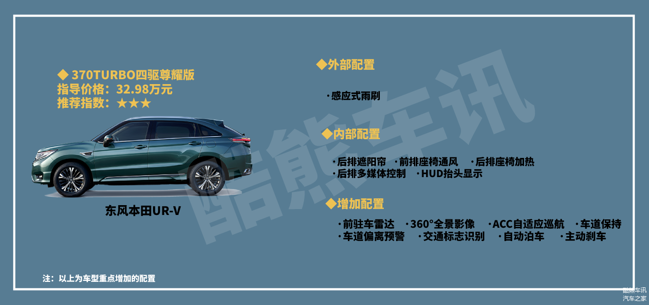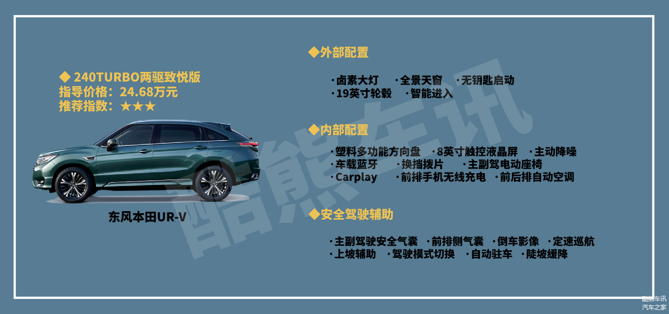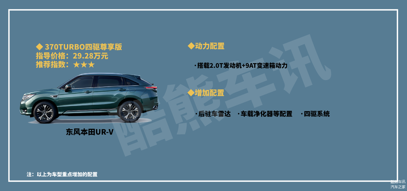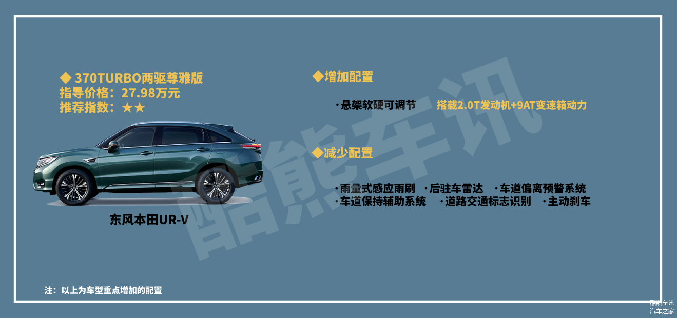 整体来看,东风本田UR-V这款车在各方面的表现还是比较出色的,我个人比较推荐大家购买240TURBO两驱致雅版车型,售价26.98万元,在配置方面比较丰富,更加注重实用性能,性价比也比较突出,搭载的是1.5T发动机+CVT无级变速箱的动力,也足可以满足日常用车需求。不推荐370TURBO两驱尊雅版车型,虽然动力提升了,但是27.98万元的售价,相比240TURBO两驱致雅版车型配置却少了很多。对动力要求过高的,可以去看看370TURBO四驱尊享版车型,换装了2.0T发动机+9AT变速箱的动力,配备四驱系统,但是售价29.28万元。