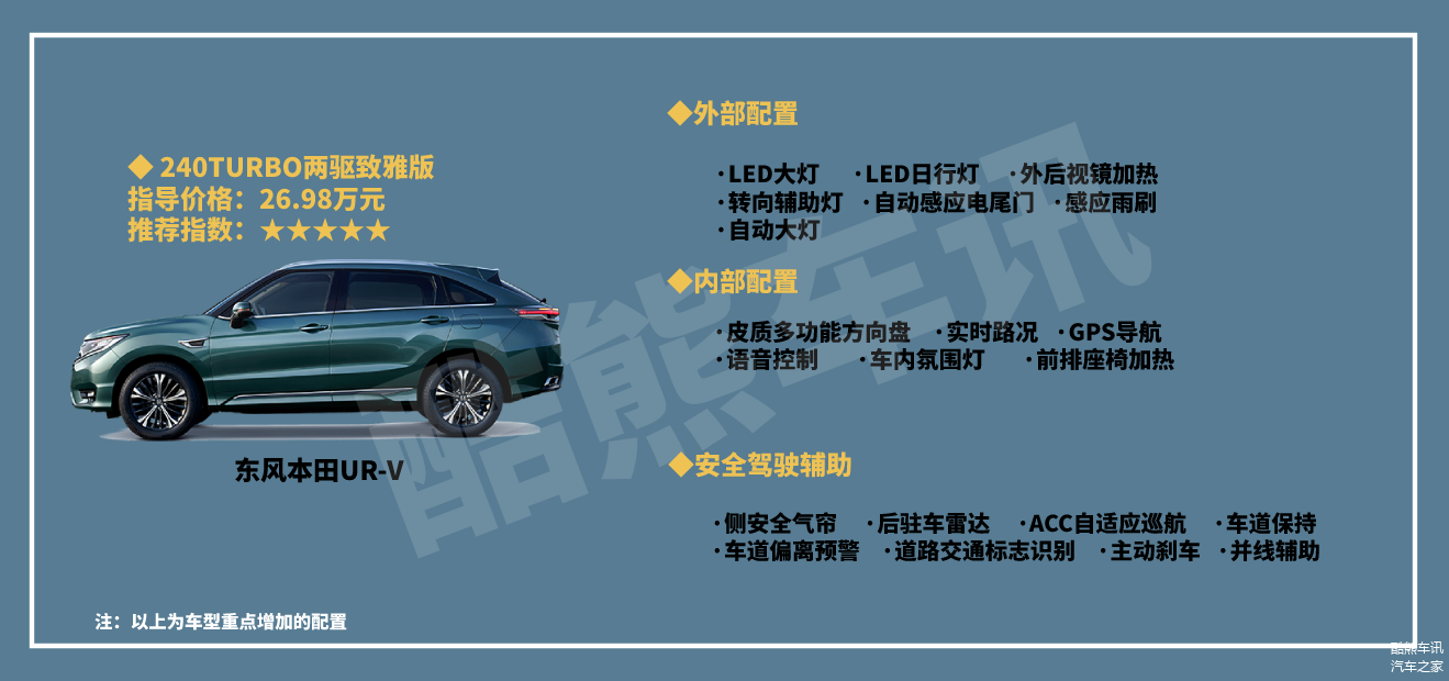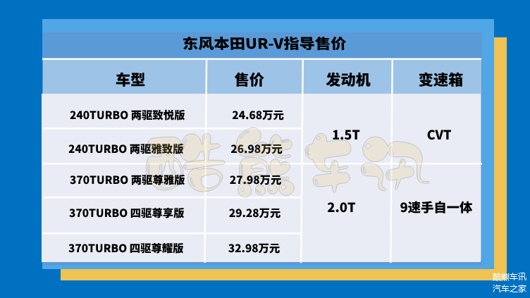 随着现如今生活水平的提高,很多人在买车的时候更注重配置和空间方面的表现,目前中型SUV市场也比较火爆,各大汽车厂商也根据市场需求把中型SUV作为发力点,优秀的产品力是每个车型的立足之根本,东风本田近几年在SUV市场的投入比较大,旗下多款SUV车型都有着很强的实力。从实用性和舒适性的角度来看,东风本田-URV这款车就有着比较出色的表现,作为东风本田的旗舰级SUV,可以满足多元化用车需求,外观颜值高端大气又能满足生活的乐趣。凭借其较高的颜值和丰富的配置,赢得了消费者们的认可,并且取得了出色的销量和口碑。东风本田-URV这款车共有5款车型可选,新车售价为24.68万-32.98万元,那么哪款车型更值得选择呢?笔者会在文中会对各车型的差异进行对比,并且推荐出值得购买的车型,下面大家一起来看看吧。