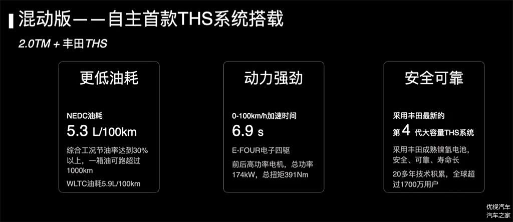 除了颜值,全新传祺GS8混动版身上所搭载的这套混动系统,也值得我们来重点聊聊。从官方资料来看,全新一代传祺GS8混动版采用了自家2.0T发动机+丰田第四代THS混合动力系统。其中,2.0T发动机最大功率190马力,最大扭矩320牛·米,电动机最大功率182马力,最大扭矩270牛·米。