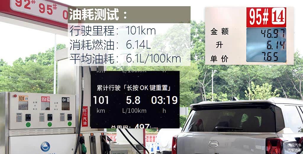 至于大家最关心的油耗表现方面,全新传祺GS8燃油版的油箱容积是65升,而混动版受限于电池布局,所以油箱容积变成了58升。从某汽车网站实测的油耗表现来看,全新传祺GS8混动版在行驶了101公里的实际里程之后,消耗的燃油为6.14L,平均油耗定格在6.1L/100km,与厂家所宣称的NEDC综合油耗5.3L/100km差距并不大。