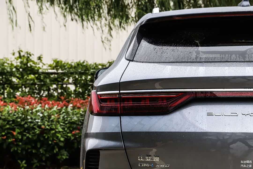 车尾依旧是圆润饱满的风格,通过不同线条的修饰后,显得十分灵动。另外,LED贯穿式龙爪尾灯与头灯组相呼应,流水转向灯以及动态迎宾效果都是添彩之作,辨识度相当高。另外,后备厢左侧的DM-i标识则进一步彰显其混动身份。