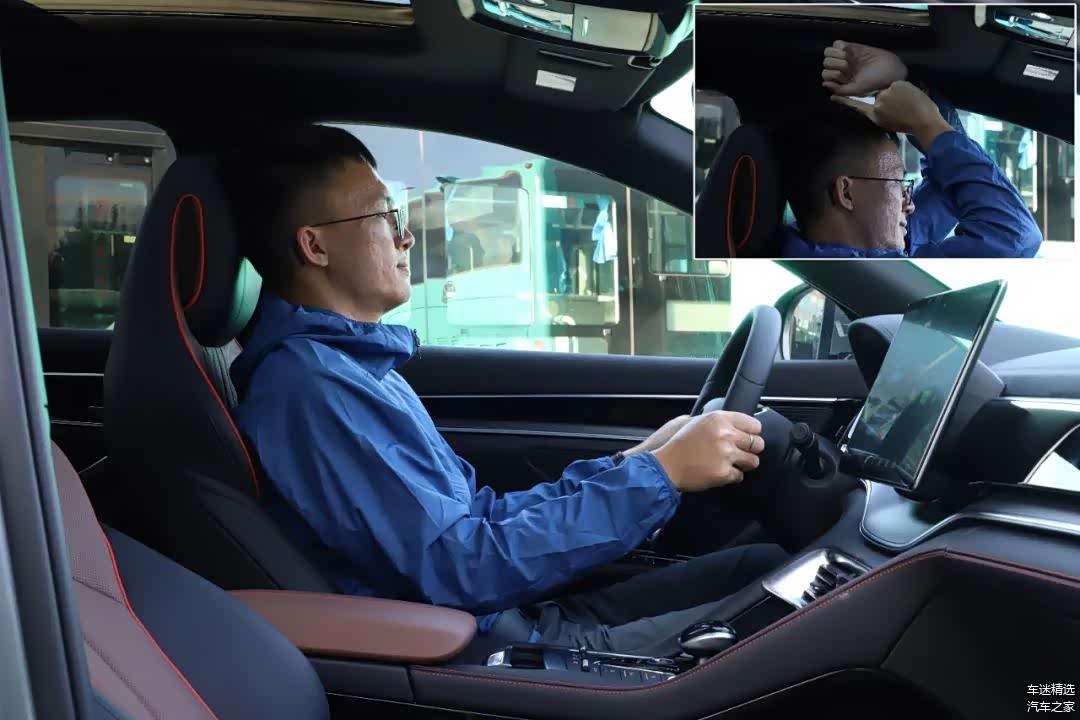 身高180cm的体验者进入前排,并将座椅位置调至最低,此时的头部空间为一拳两指左右,表现中规中矩,并没有压抑的感觉。