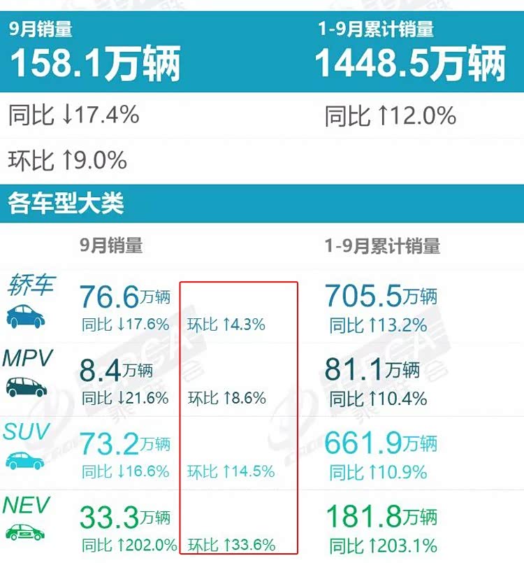 不过,9月份的轿车、SUV和MPV的环比都是正增长,这说明汽车市场在恢复中。如果能保持8月、9月的同比增长趋势,不失为一件喜事。