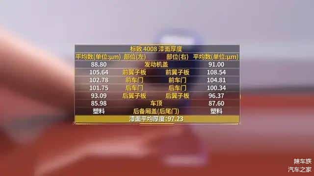 通过拆解可以发现,神龙汽车东风标致全新4008漆面部分使用的是更环保更薄的水性漆,平均漆面厚度为97.23微米,整体漆面厚度在测过的车型中相对较薄。漆面均匀程度方面,用所有取样点数据的方差进行量化,全新4008漆面厚度的方差是114.9。漆面硬度部分,实测漆面硬度为HB-H之间,居于主流水平。