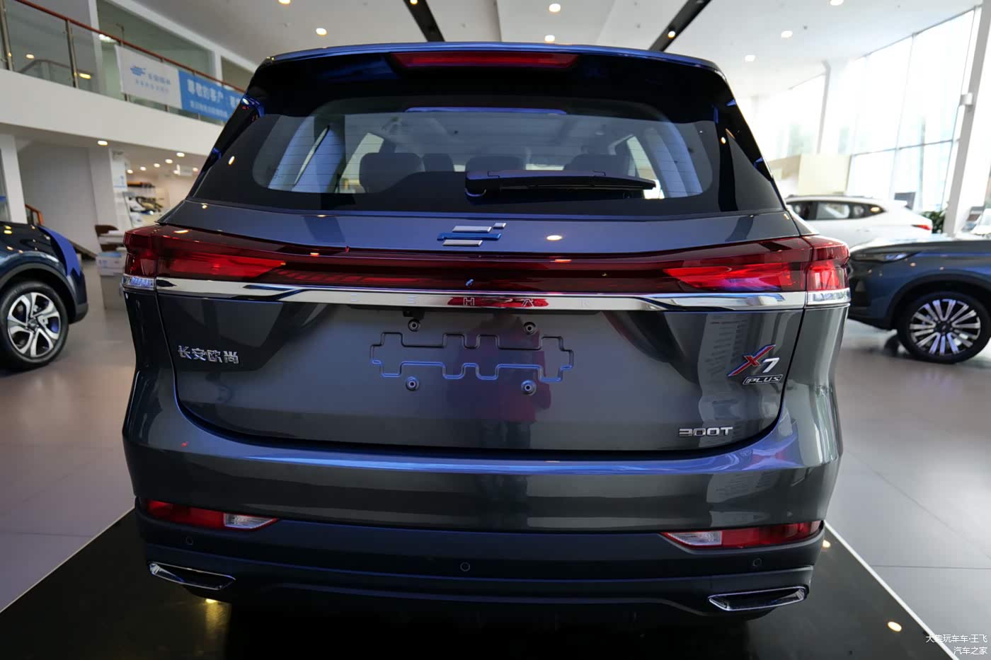 X7PLUS全系均采用了蓝鲸新一代NE1.5T高压直喷发动机,但是手动挡和自动挡的功率和扭矩不同:手动挡的低一些,为125kW(170马力)和260N·m。自动挡车型则是138kW(188马力)和300N·m,这个参数,特别是扭矩在一众国产同行和合资车同排量发动机面前都是挺能打的。实拍展车是自动挡车型,车尾有300T的标识。