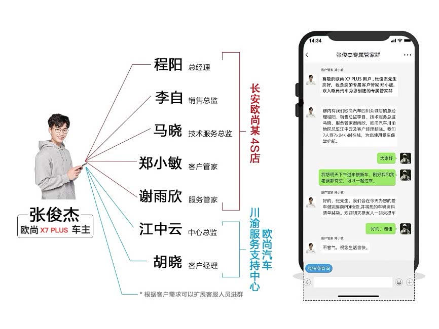 长安欧尚称给每位车主会建立一个微信群,为车主提供专属管家服务。群成员包括经销商人员和长安欧尚总部的职能人员,说起来简单,但想想都可以预测到背后会有多大工作量。现在几乎所有车厂都会说自己是用户型企业,长安欧尚这种做法可以说是一个新实践,虽然给自己添了麻烦,但是给了用户方便。