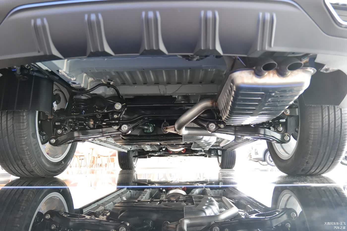 趴下来给大伙儿拍拍车底:前后独立悬挂,全系没有四驱,这个角度可见后保险杠上的两个排气口是装饰性的,但确实是双排气口,只不过是单边双出。