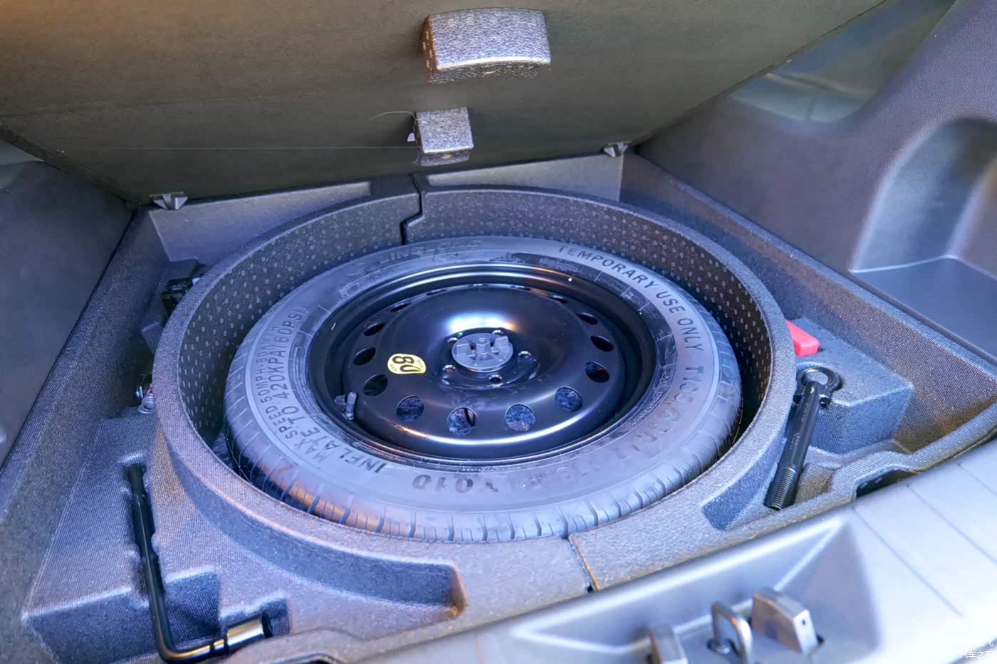 后备厢地板下有备胎,虽然是小备胎,但是我觉得这样更好,毕竟备胎很少用到,小备胎省一些空间和油耗多好。