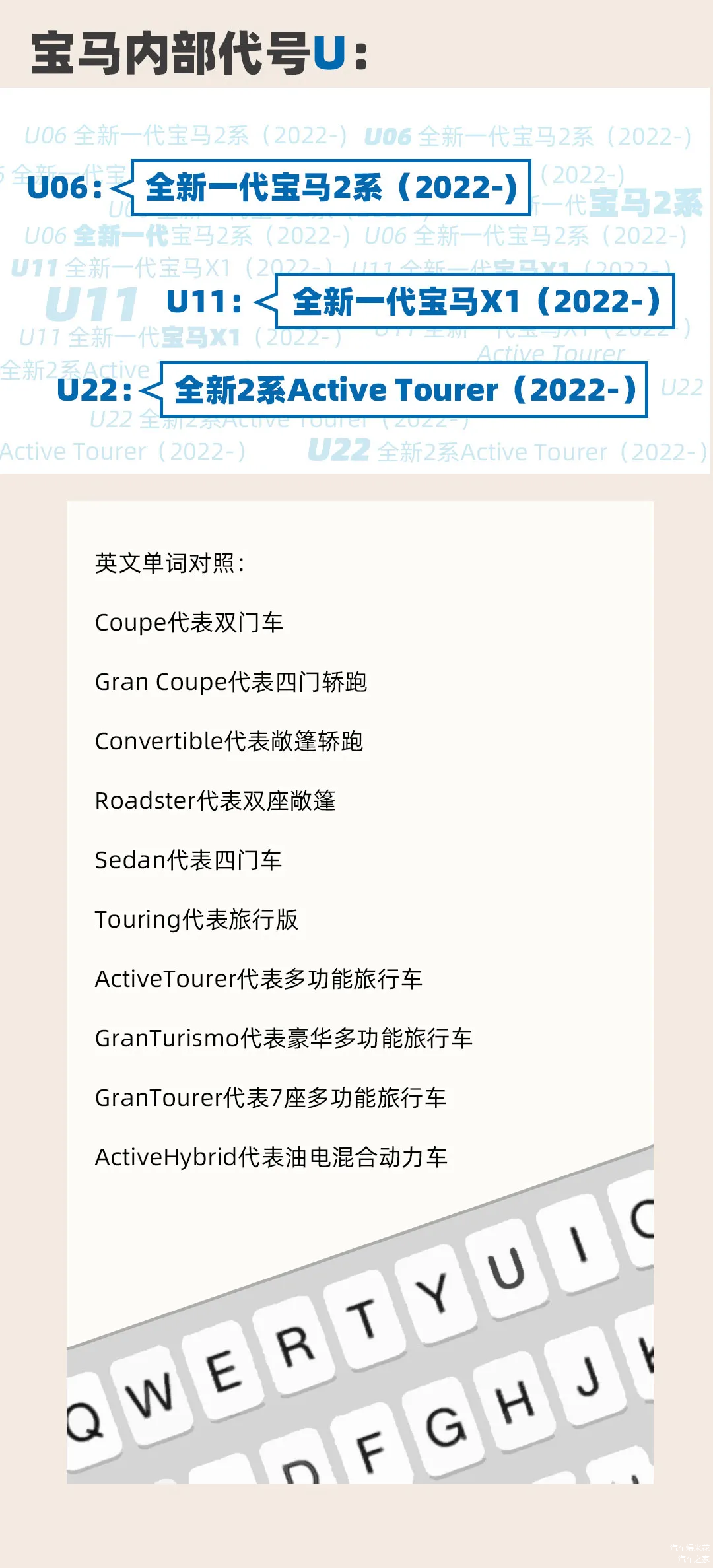 现在呢?宝马正在使用“G+数字”的代号模式来指代它的车型,最后,从新一代的X1和2系开始宝马又取用了全新代号为 “U”系的底盘了。