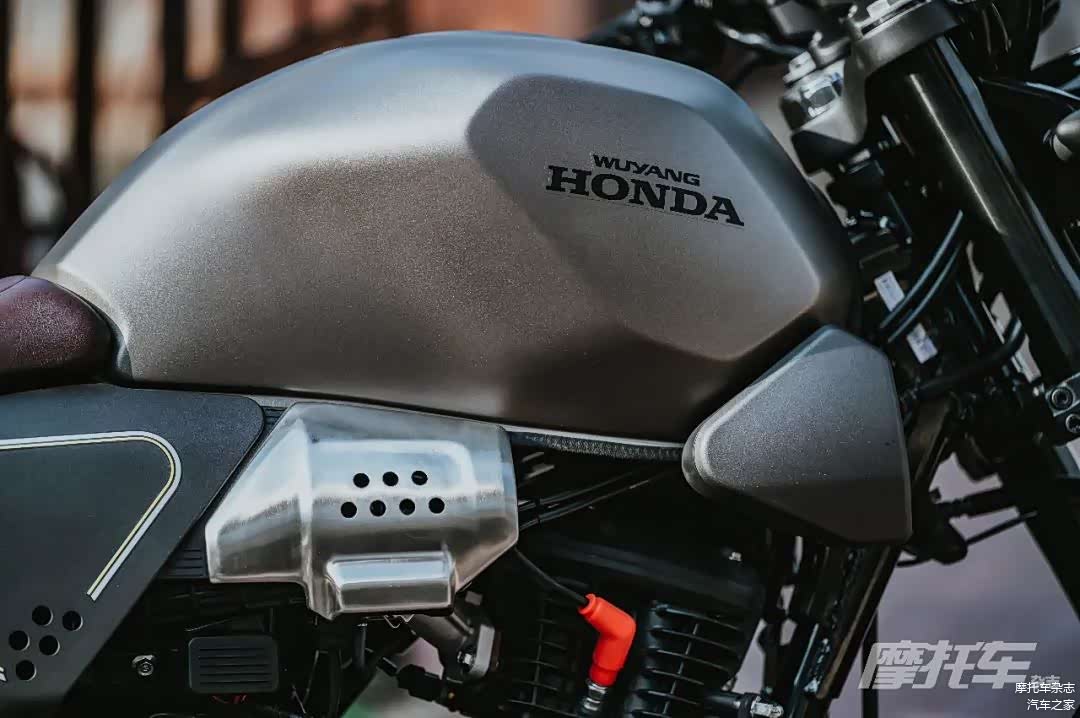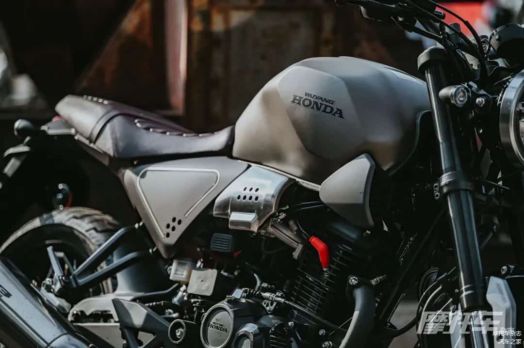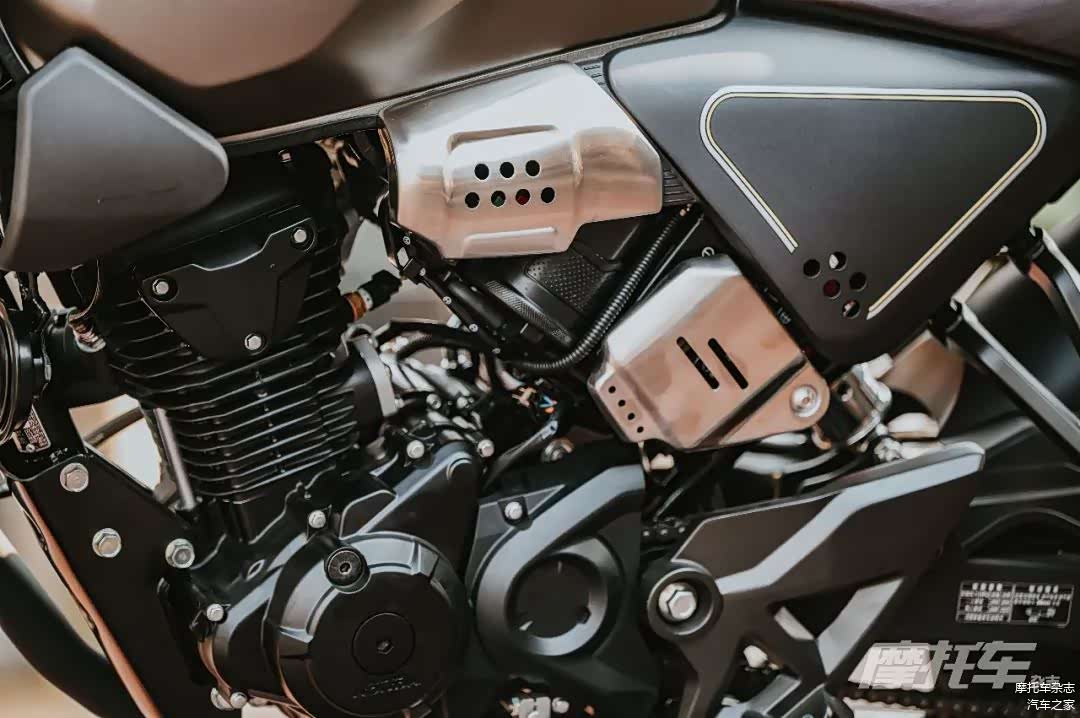 新款CB190SS依旧保留了复古的外观风格,但在一些细节上增加了整车的质感。首先就是整体材质的变化,全车基本采用了磨砂材质的覆盖件,哑光装甲灰配色甚至连油箱都做了磨砂处理,相比老款更加时尚。油箱的造型变得更加立体,和老款比较圆润的油箱相比,新款油箱线条更加明显,一定程度增加了整车的层次感。油箱下的装饰件做了仿进气口造型,增加运动感。座垫下的侧盖造型上也进行了重新设计,几乎和座垫前端等宽的侧盖一定程度降低了车身宽度,停车落腿更加方便。同时整车多处增加了拉丝效果的金属覆盖件,在细节上提升了质感。