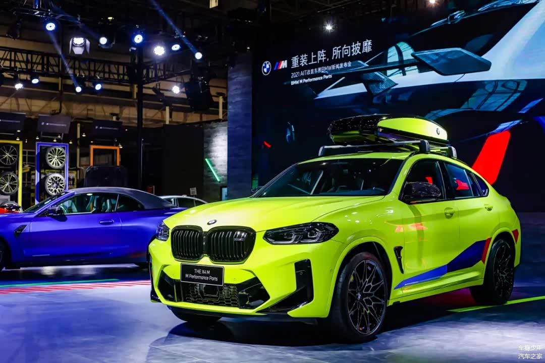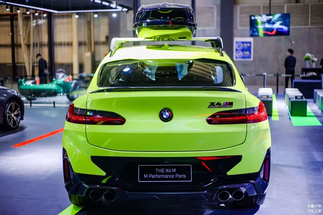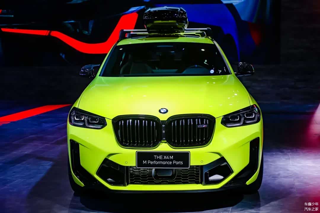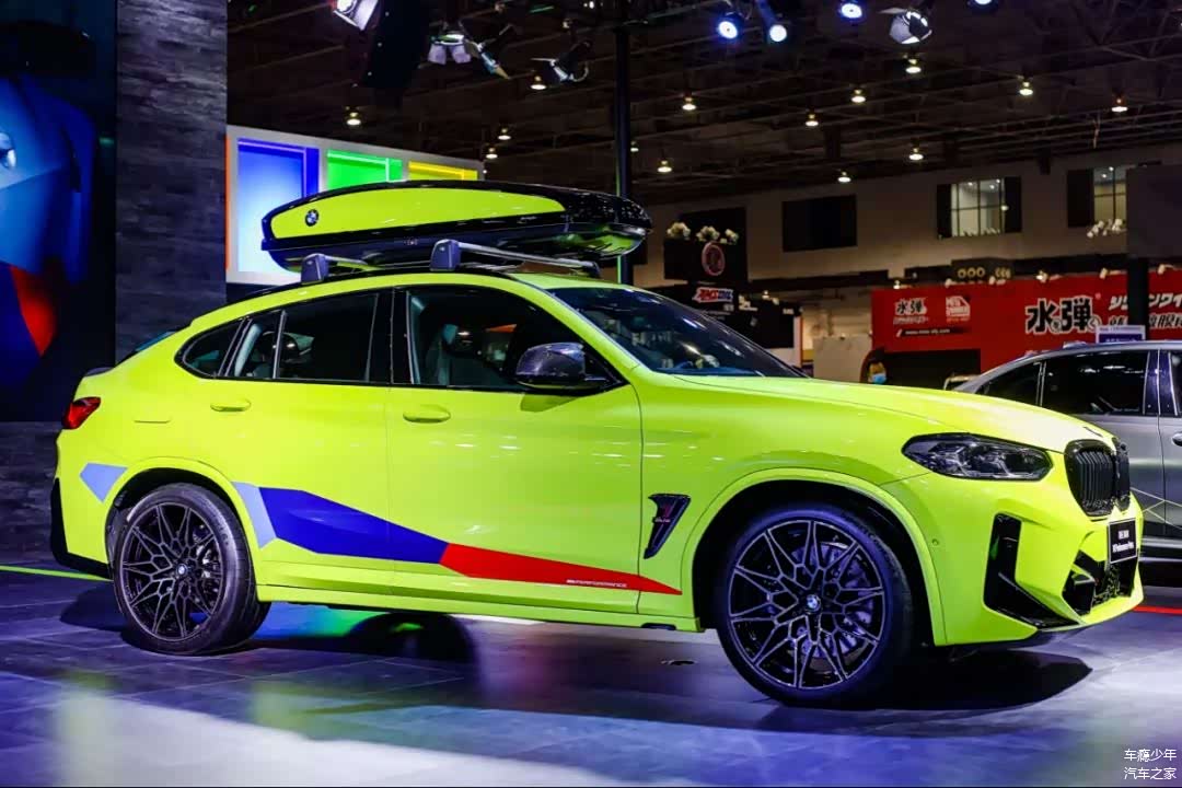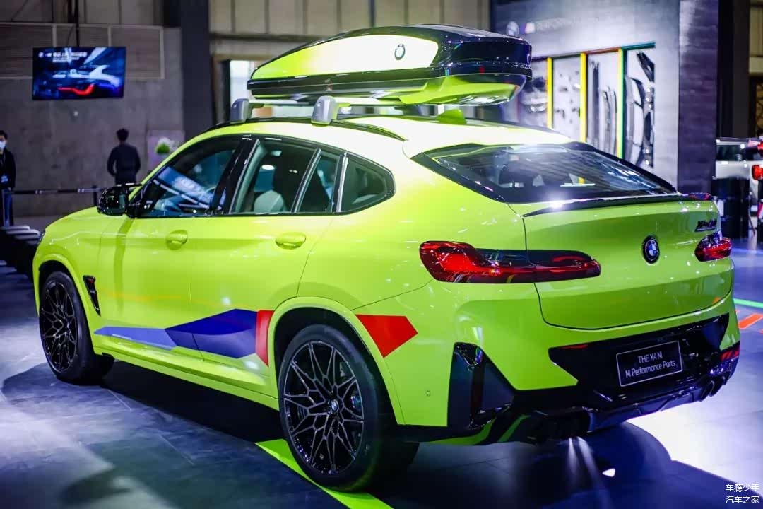 而配备M Performance Parts高性能配件之后,这台宝马X4M的双肾格栅、后视镜、尾翼等地方都换成了碳纤维饰板,而且车顶还额外加入了行李箱设计,车身侧面的M三色拉花显得格外运动。