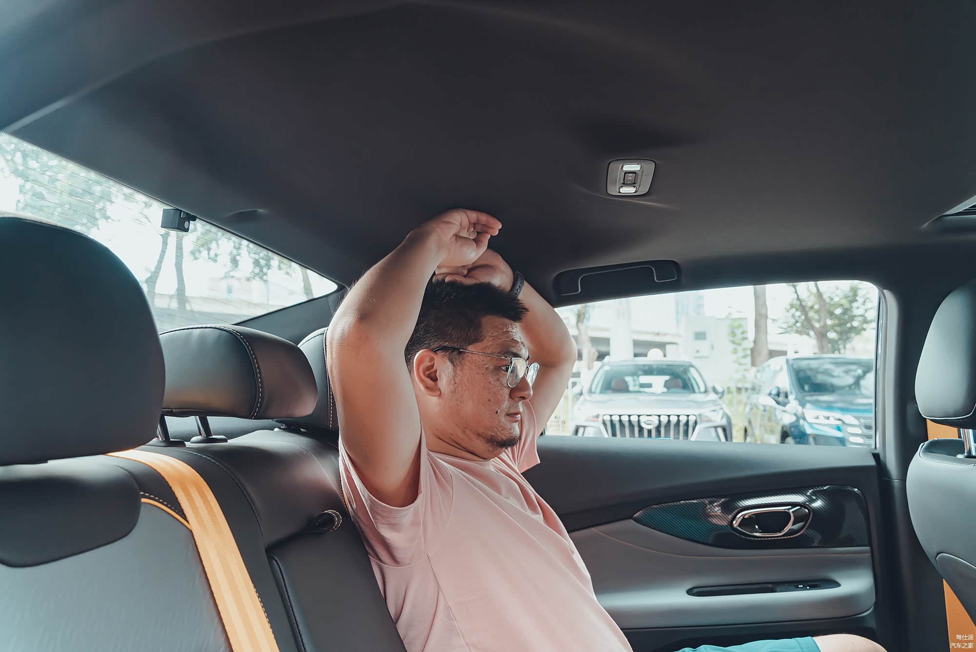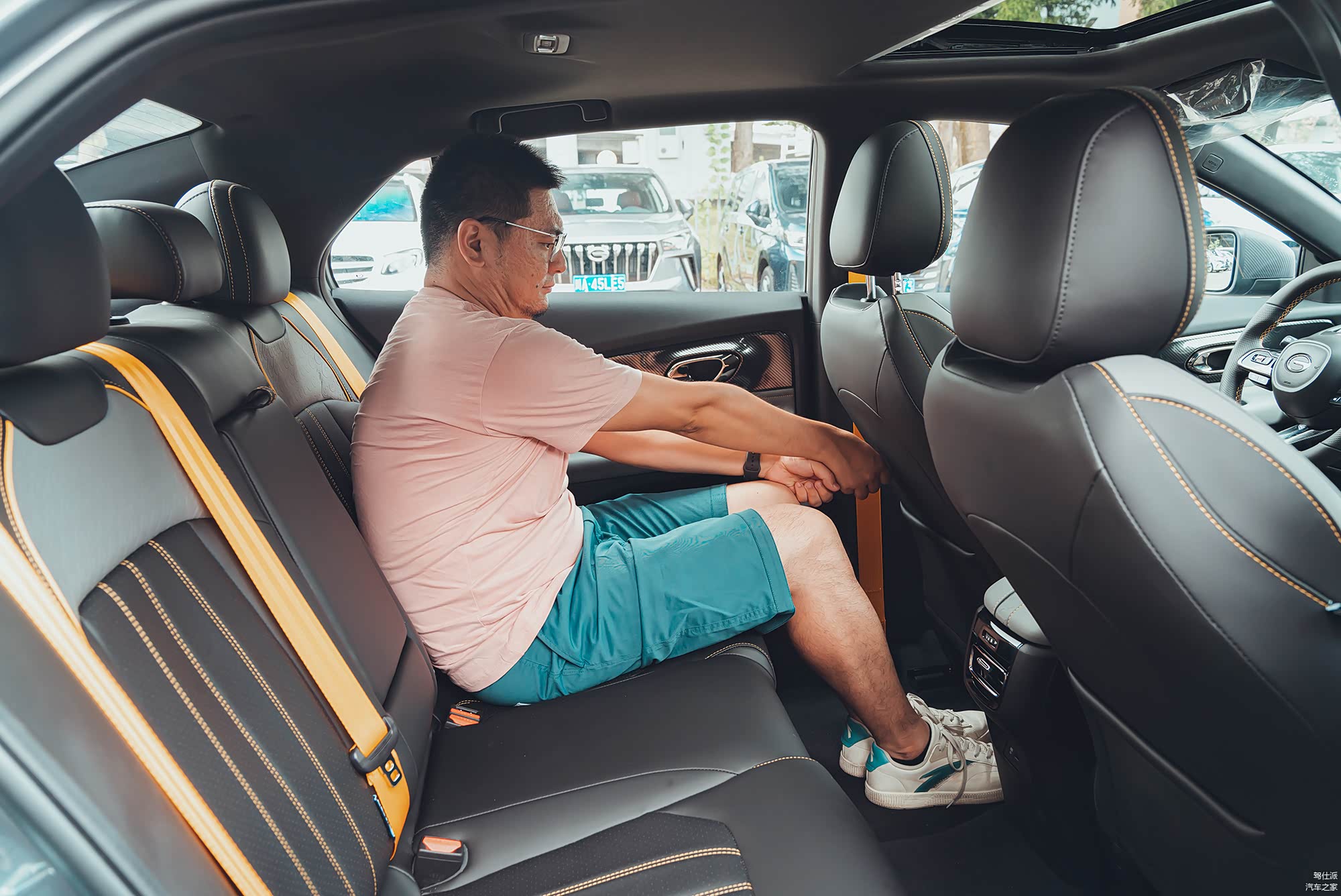 需要指出的是,虽然影豹长得这么运动,却也没有忘记自己作为家轿的本分。我身高178cm,从驾驶位来到后座,腿部还有两拳以上的空间,头部空间也还有余量。此外,影豹的后排地板中间凸起不高,舒适性配置也很全面,加上我开的这台顶配车型还配备了一个巨大尺寸的全景天幕,整体的乘坐感受非常不错。