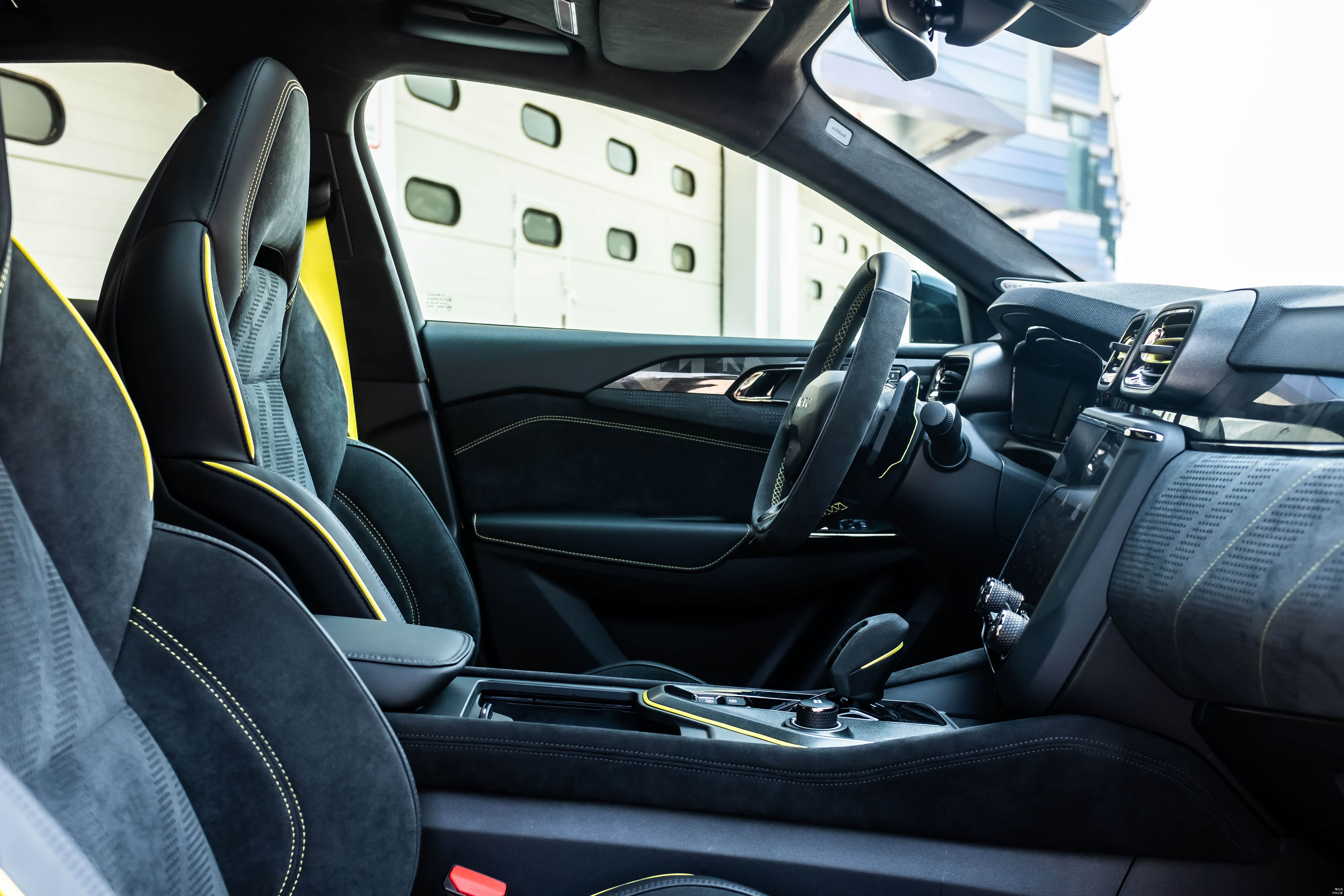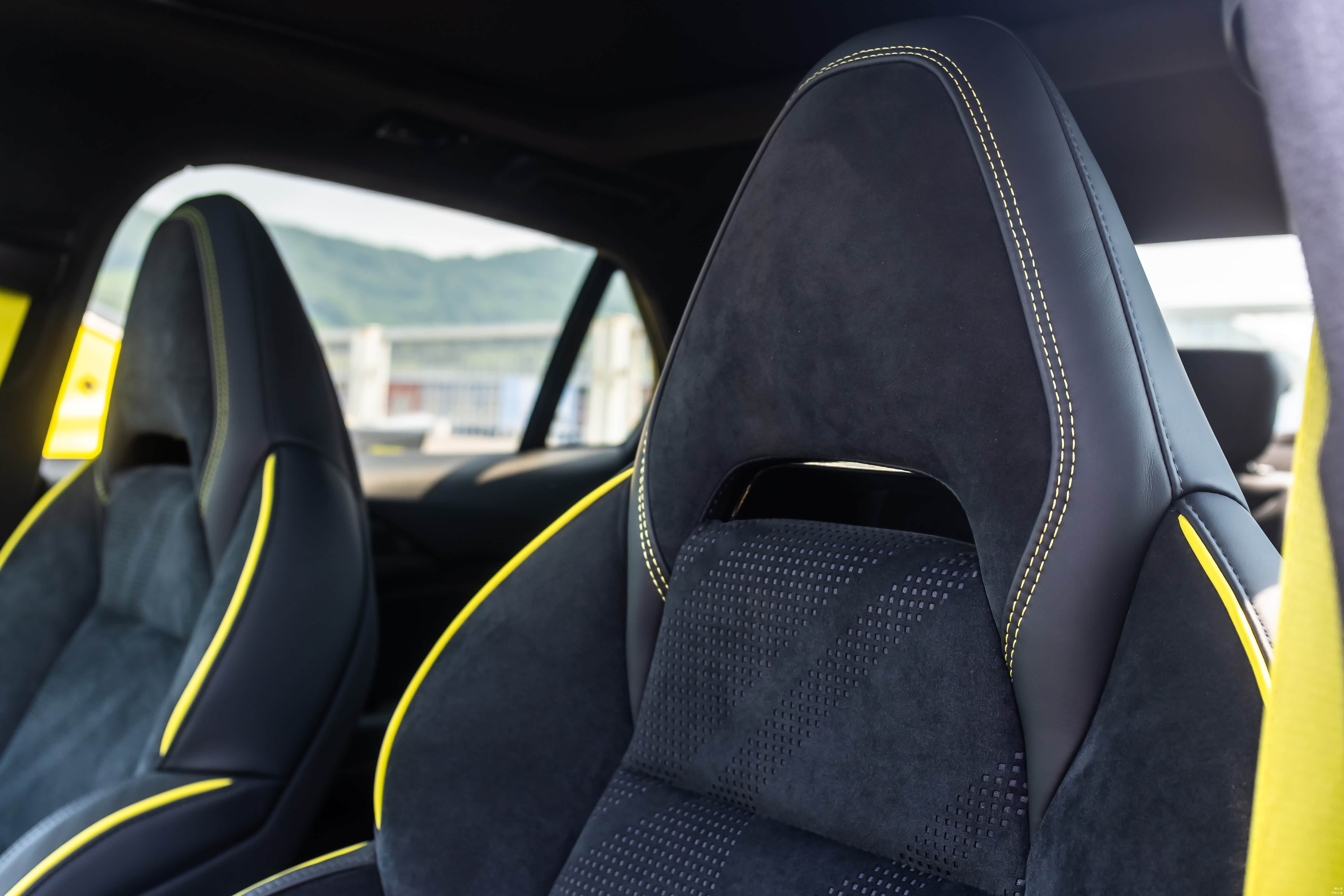 拉开车门就能看到的麂皮质感桶形座椅会更迎合目标群体的口味,粗壮的平底方向盘用上Alcantara后的握感也有几分AMG的气质,整个全黑色的内饰氛围没有丝毫居家的气质,和外观相仿的金黄色缝线、装饰条和安全带,点缀出了更多活力。