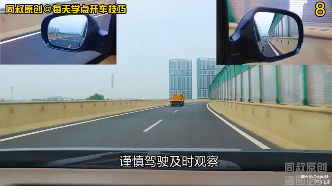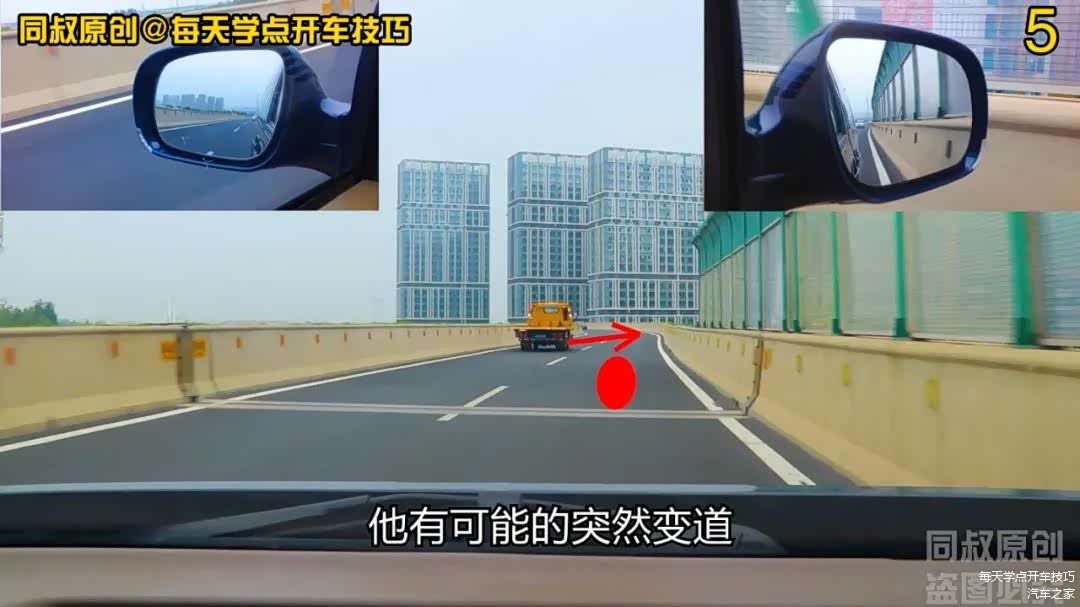 前方这辆拖车行驶在左侧车道,车速并不快,在不适合超车的情况下,与他保持距离,一个是避免距离太近时,他有可能的突然变道;另一个是为了方便左侧车道后方有快车,有超车的需求,防止后方车辆超车不成而与我保持并行。