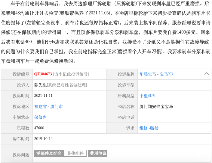 近日,在汽车投诉网上就收到这样一则投诉。来自福建的车主陈先生,曾于2019年10月份在福建厦门本地的一家宝马4s店购买了一台华晨 宝马-X3(图片 | 参数 | 询价) 车型,但是最近陈先生就因为车子的问题遇上了烦心事。