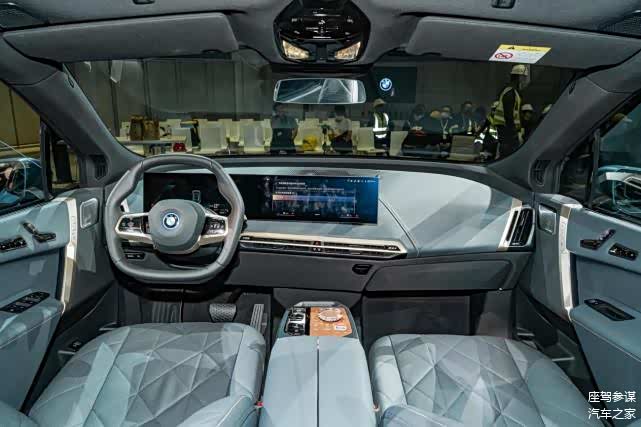 坐进宝马iX车内,瞬间就能判断出这是一台电动车。宝马车标底部明显有一圈象征着电动的蓝背景色,一体式双连屏配合撞色的扶手台,让车内蓝色中控台与类似木纹的扶手台形成强烈的视觉冲击与色彩反差,菱形打孔真皮座椅与超大面积全景天幕强调了它接近百万级的尊贵身份。