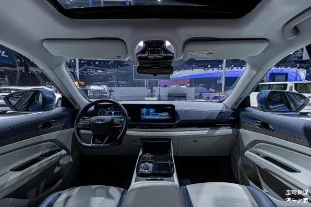 进入到车内,一股年轻人喜欢的轻奢风扑面而来,与福特领裕Equator有些相似,但又有些许不同之处。液晶仪表盘+中控双连屏与下出风口融为一体,平底式运动方向盘再次强调了福特领睿的运动性,T形中控扶手台物理按键区域分工明确,旋钮电子换挡实乃画龙点睛之笔。如果要问我最喜欢哪里,我想深蓝色与米灰色内饰配色就已经能俘获不少年轻用户的芳心了。